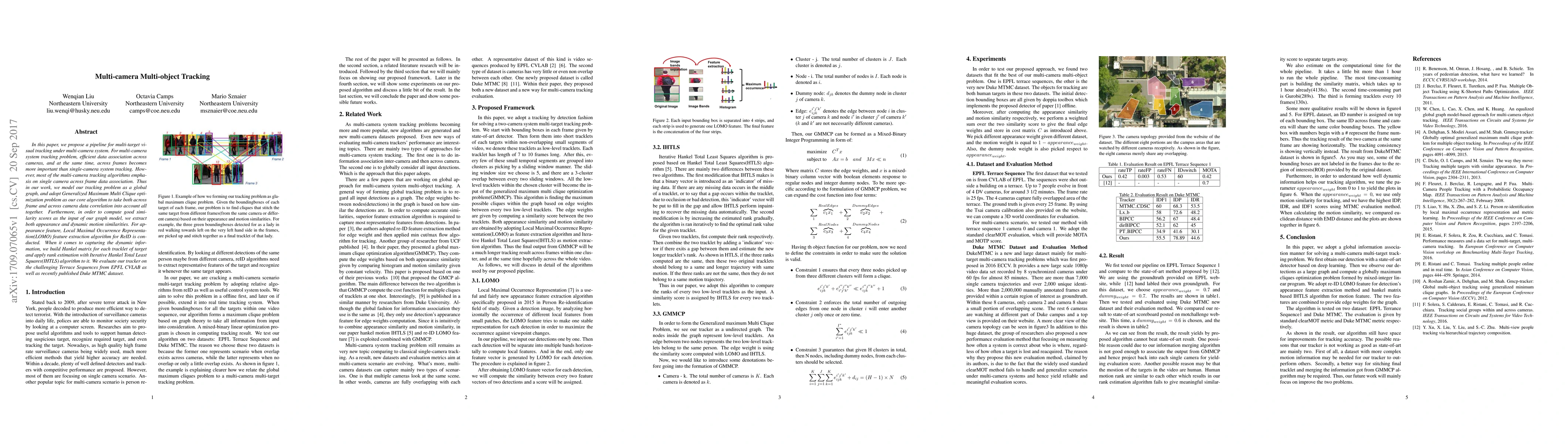 This paper presents a multi-camera multi-object tracking pipeline that uses a global graph approach with Generalized Maximum Multi Clique optimization to efficiently associate data across cameras and frames. It employs LOMO for appearance features and IHTLS for dynamic motion similarities, and evaluates the method on the Terrace Sequences and Duke MTMC datasets.