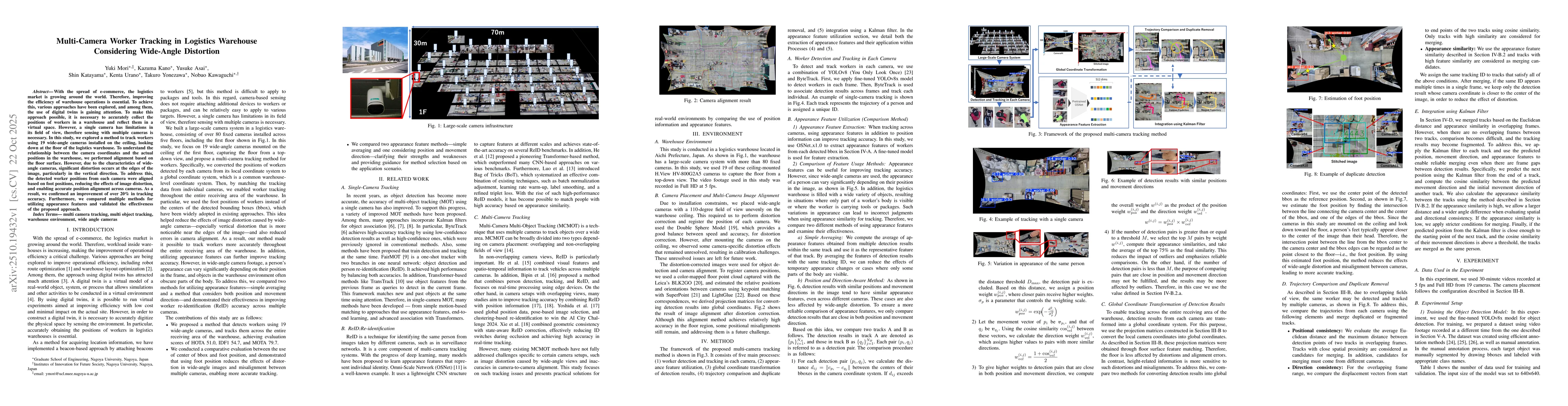 Proposed a method that integrates spatial (foot position) and appearance features for multi-camera worker tracking, with distortion correction and global coordinate transformation techniques.