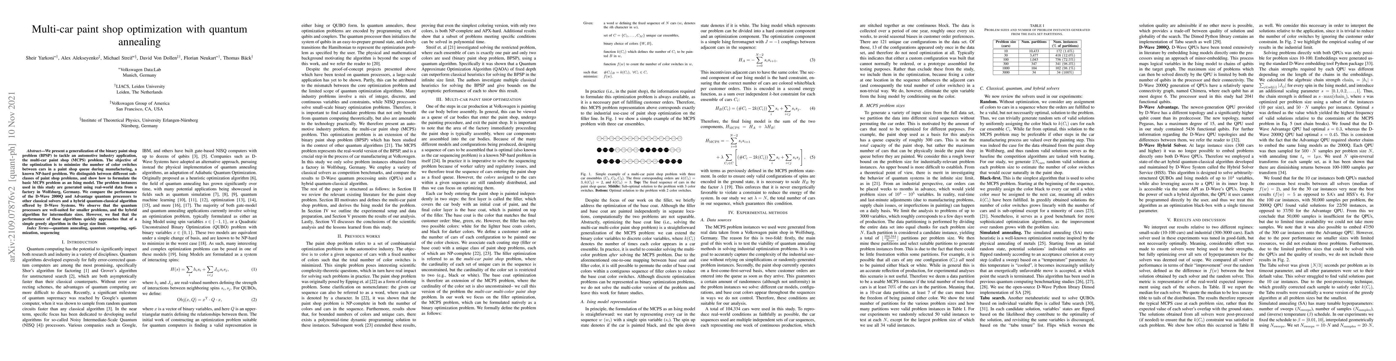 Researchers optimized paint shop production using quantum annealing to minimize color switches between cars, finding that quantum processors excel at small problems and hybrid algorithms at intermediate sizes.
