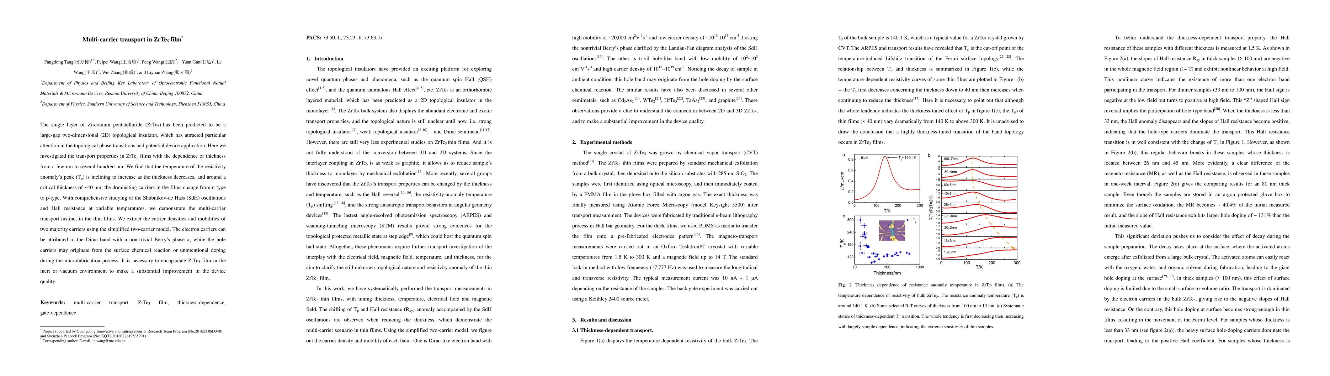 Research on ZrTe5 films reveals that the transition from n-type to p-type carriers at thin thicknesses indicates multi-carrier transport, with Dirac band electrons and surface-induced holes.