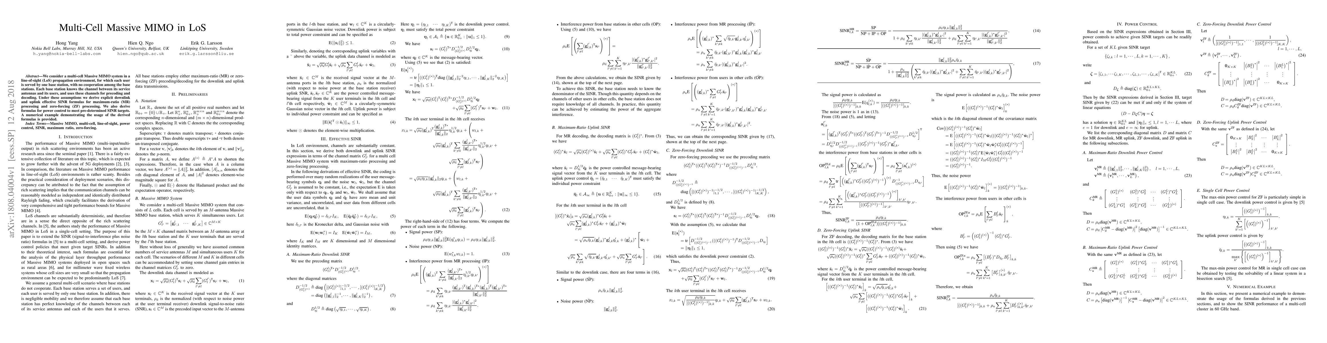 This paper analyzes a multi-cell Massive MIMO system in line-of-sight conditions, deriving explicit formulas for downlink and uplink effective SINR under maximum-ratio and zero-forcing processing. It also provides power control formulas to meet SINR targets, supported by a numerical example.