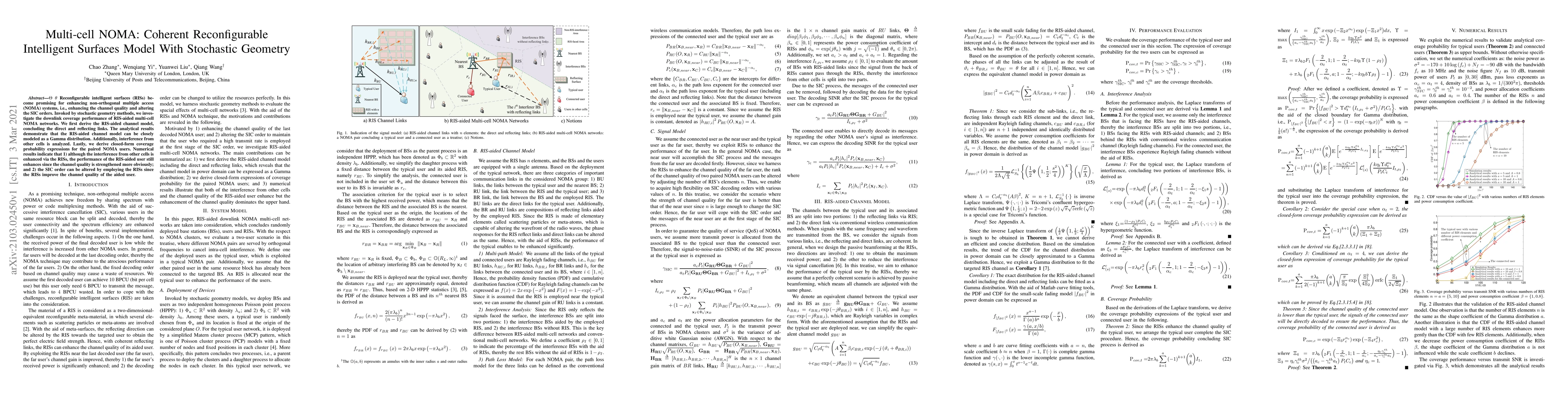 This paper investigates the downlink coverage performance of RIS-aided multi-cell NOMA networks using stochastic geometry. It derives a RIS-aided channel model and shows that it can be modeled as a Gamma distribution, demonstrating improved channel quality and altered successive interference cancellation (SIC) orders.
