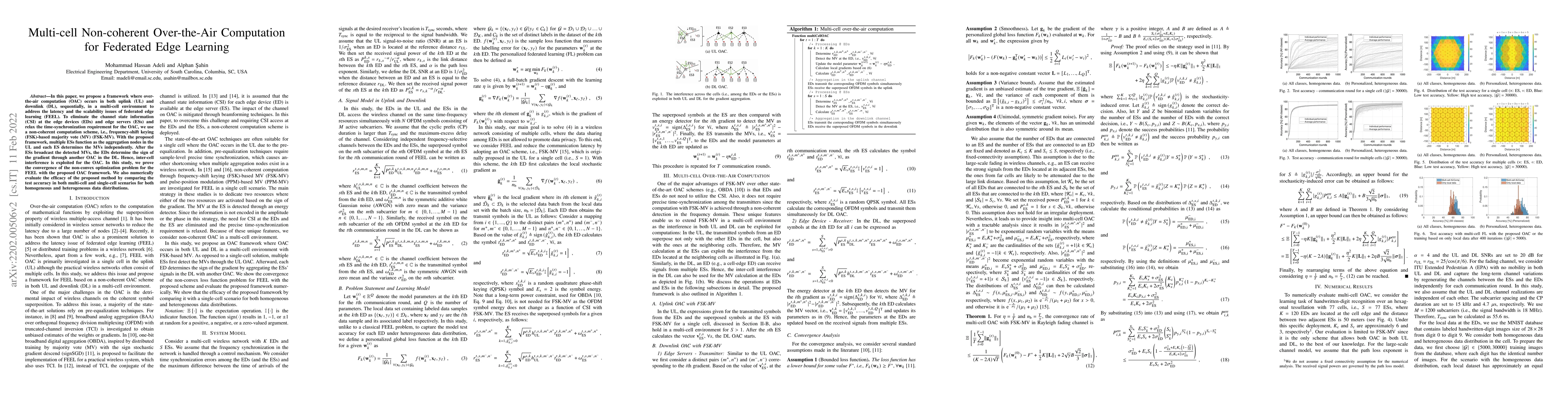 This paper proposes a multi-cell non-coherent over-the-air computation framework for federated edge learning to tackle latency and scalability issues. It employs FSK-MV to eliminate channel state information and time-synchronization, enabling convergence and improved test accuracy across various data distributions.