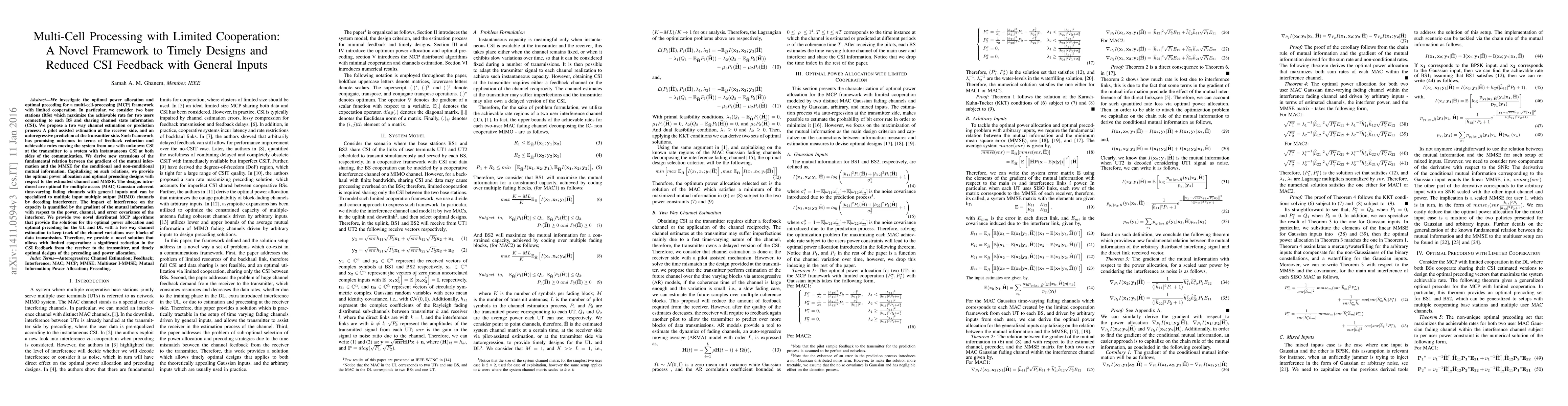 We investigate the optimal power allocation and optimal precoding for a multi-cell-processing (MCP) framework with limited cooperation. In particular, we consider two base stations(BSs) which maximize the achievable rate for two users connecting to each BS and sharing channel state information (CSI). We propose a two way channel estimation or prediction process. Such framework has promising outcomes in terms of feedback reduction and acheivable rates moving the system from one with unkown CSI at the transmitter to a system with instantanous CSI at both sides of the communication. We derive new extentions of the fundamental relation between the gradient of the mutual information and the MMSE for the conditional and non-conditional mutual information. Capitalizing on such relations, we provide the optimal power allocation and optimal precoding designs with respect to the estimated channel and MMSE. The designs introduced are optimal for multiple access (MAC) Gaussian coherent time-varying fading channels with general inputs and can be specialized to multiple input multiple output (MIMO) channels by decoding interference. The impact of interference on the capacity is quantified by the gradient of the mutual information with respect to the power, channel, and error covariance of the interferer. We provide two novel distributed MCP algorithms that provide the solutions for the optimal power allocation and optimal precoding for the UL and DL with a two way channel estimation to keep track of the channel variations over blocks of data transmission. Therefore, we provide a novel solution that allows with limited cooperation: a significant reduction in the CSI feedback from the receiver to the transmitter, and timely optimal designs of the precoding and power allocation.