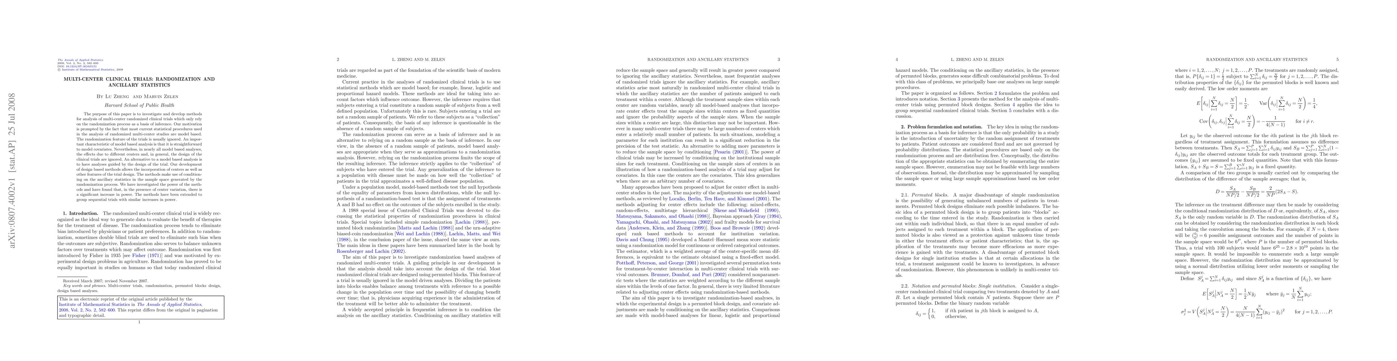 The purpose of this paper is to investigate and develop methods for analysis of multi-center randomized clinical trials which only rely on the randomization process as a basis of inference. Our motivation is prompted by the fact that most current statistical procedures used in the analysis of randomized multi-center studies are model based. The randomization feature of the trials is usually ignored. An important characteristic of model based analysis is that it is straightforward to model covariates. Nevertheless, in nearly all model based analyses, the effects due to different centers and, in general, the design of the clinical trials are ignored. An alternative to a model based analysis is to have analyses guided by the design of the trial. Our development of design based methods allows the incorporation of centers as well as other features of the trial design. The methods make use of conditioning on the ancillary statistics in the sample space generated by the randomization process. We have investigated the power of the methods and have found that, in the presence of center variation, there is a significant increase in power. The methods have been extended to group sequential trials with similar increases in power.