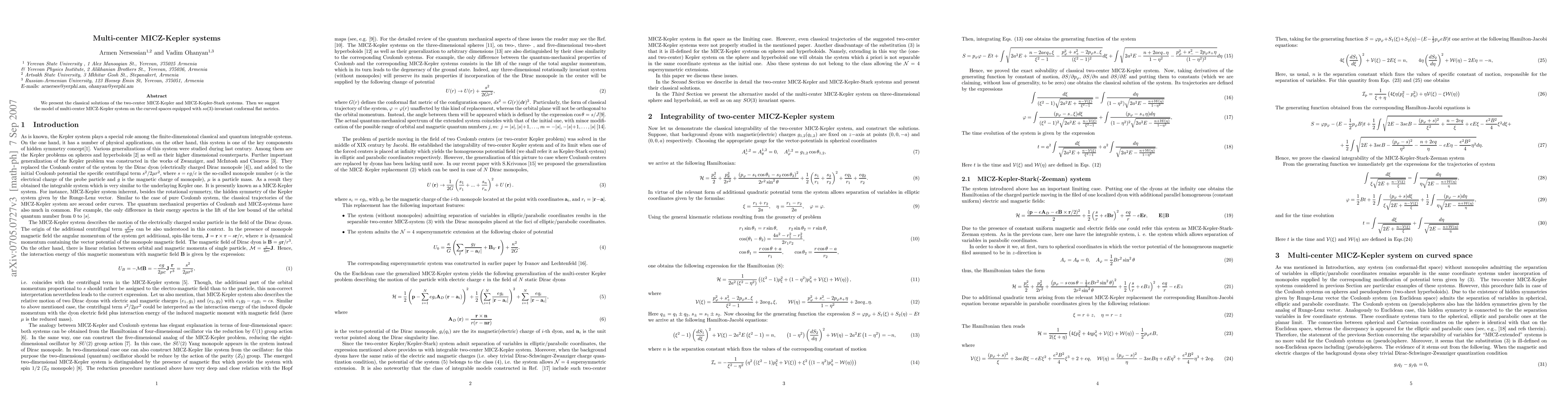 Summary: This paper explores classical solutions for two-center MICZ-Kepler and MICZ-Kepler-Stark systems and proposes a model for multi-center MICZ-Kepler systems on curved spaces with $so(3)$-invariant conformal flat metrics.