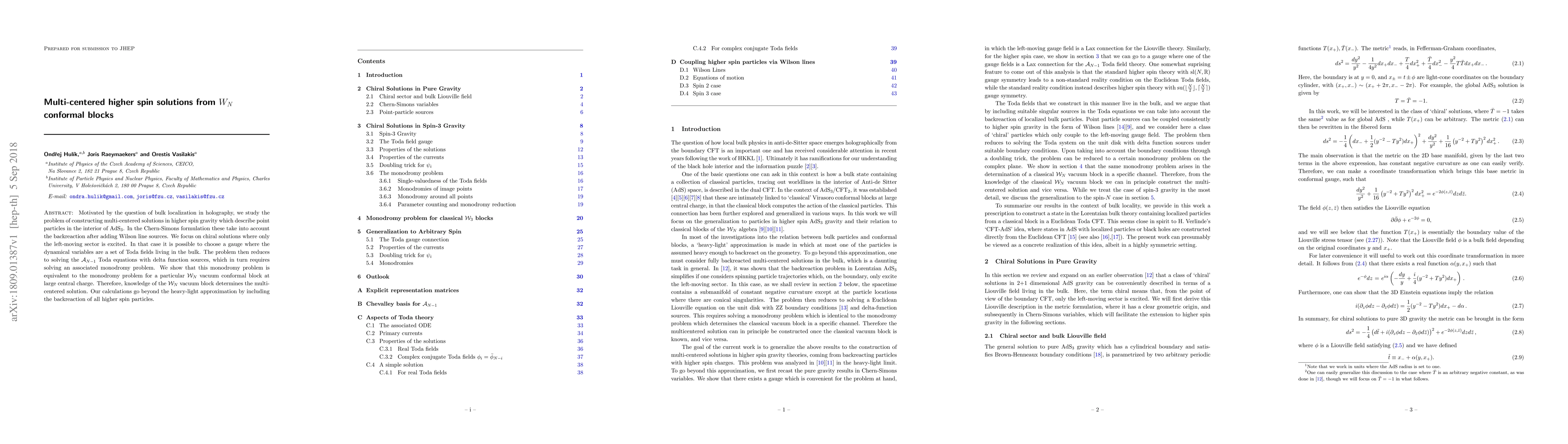 Motivated by the question of bulk localization in holography, we study the problem of constructing multi-centered solutions in higher spin gravity which describe point particles in the interior of AdS$_3$. In the Chern-Simons formulation these take into account the backreaction after adding Wilson line sources. We focus on chiral solutions where only the left-moving sector is excited. In that case it is possible to choose a gauge where the dynamical variables are a set of Toda fields living in the bulk. The problem then reduces to solving the $\mathcal{A}_{N-1}$ Toda equations with delta function sources, which in turn requires solving an associated monodromy problem. We show that this monodromy problem is equivalent to the monodromy problem for a particular $\mathcal{W}_N$ vacuum conformal block at large central charge. Therefore, knowledge of the $\mathcal{W}_N$ vacuum block determines the multi-centered solution. Our calculations go beyond the heavy-light approximation by including the backreaction of all higher spin particles.