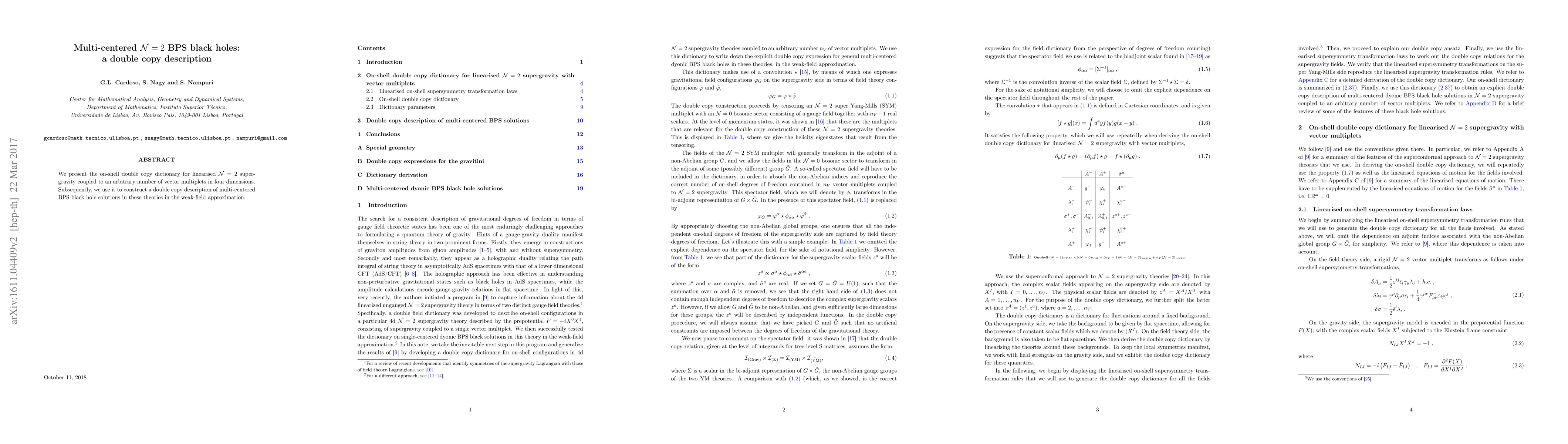 We present the on-shell double copy dictionary for linearised ${\mathcal N}=2$ supergravity coupled to an arbitrary number of vector multiplets in four dimensions. Subsequently, we use it to construct a double copy description of multi-centered BPS black hole solutions in these theories in the weak-field approximation.