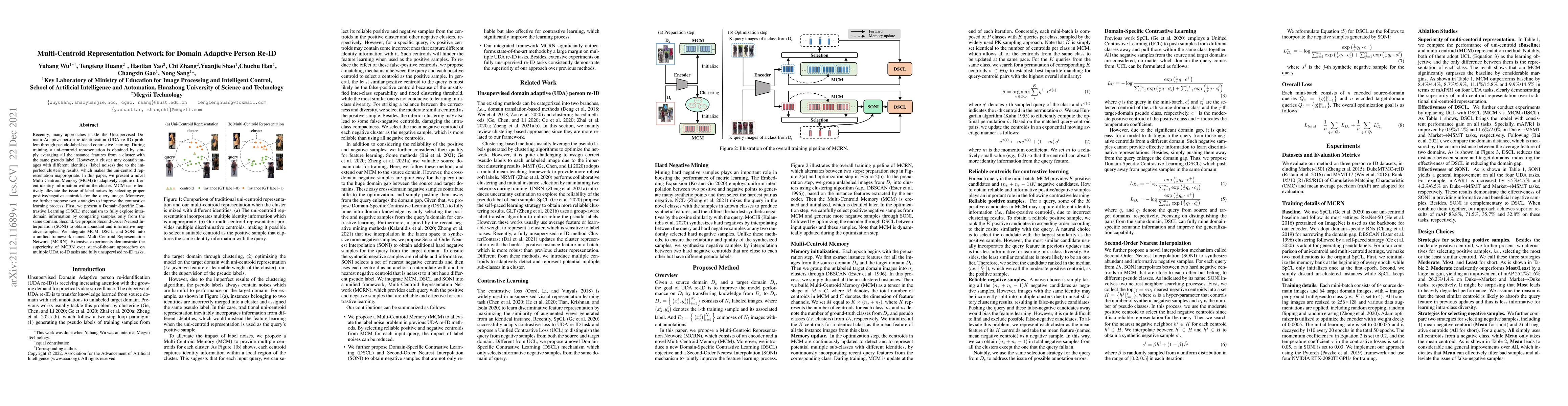 This paper introduces a Multi-Centroid Representation Network (MCRN) for unsupervised domain adaptive person re-identification, addressing label noise through a Multi-Centroid Memory (MCM) that captures diverse identity information within clusters. It also employs Domain-Specific Contrastive Learning (DSCL) and Second-Order Nearest Interpolation (SONI) to enhance contrastive learning, achieving superior performance over existing methods.