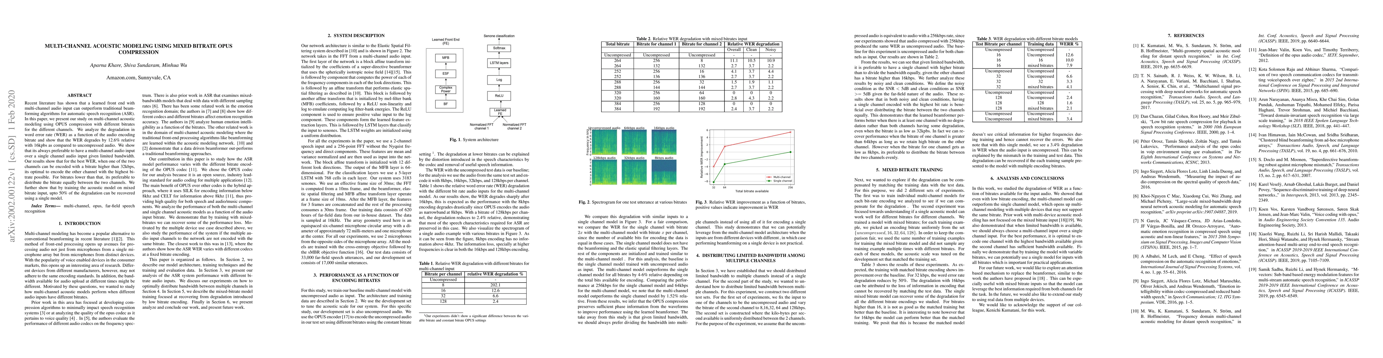 Recent literature has shown that a learned front end with multi-channel audio input can outperform traditional beam-forming algorithms for automatic speech recognition (ASR). In this paper, we present our study on multi-channel acoustic modeling using OPUS compression with different bitrates for the different channels. We analyze the degradation in word error rate (WER) as a function of the audio encoding bitrate and show that the WER degrades by 12.6% relative with 16kpbs as compared to uncompressed audio. We show that its always preferable to have a multi-channel audio input over a single channel audio input given limited bandwidth. Our results show that for the best WER, when one of the two channels can be encoded with a bitrate higher than 32kbps, its optimal to encode the other channel with the highest bitrate possible. For bitrates lower than that, its preferable to distribute the bitrate equally between the two channels. We further show that by training the acoustic model on mixed bitrate input, up to 50% of the degradation can be recovered using a single model.