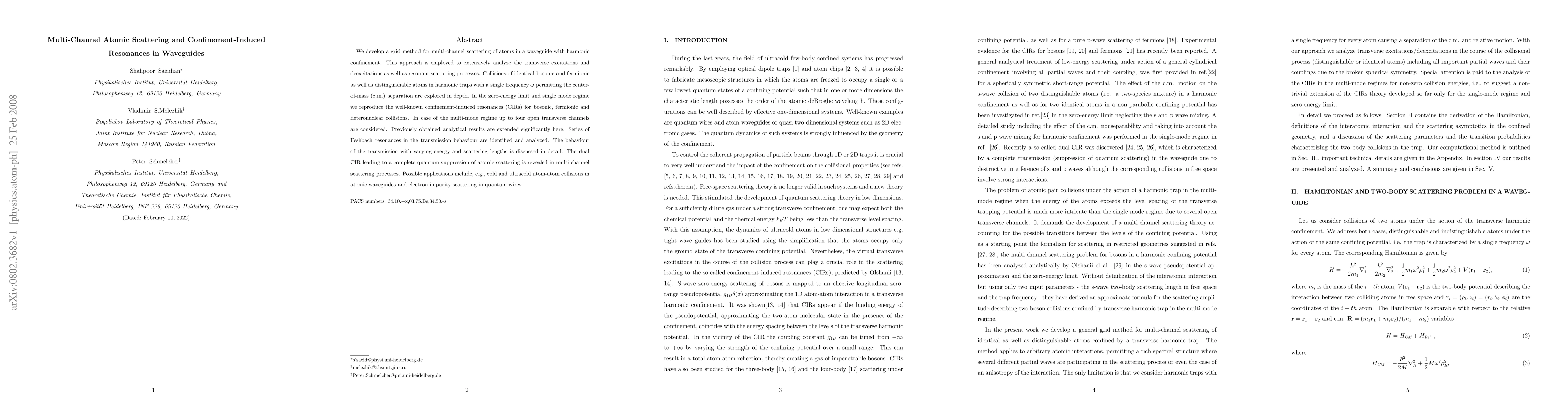 The paper develops a grid method to study multi-channel atomic scattering in waveguides with harmonic confinement, analyzing both resonance and transmission behaviors, and revealing complete quantum suppression of scattering in certain conditions. Applications extend to cold atom collisions and electron-impurity scattering in quantum wires.