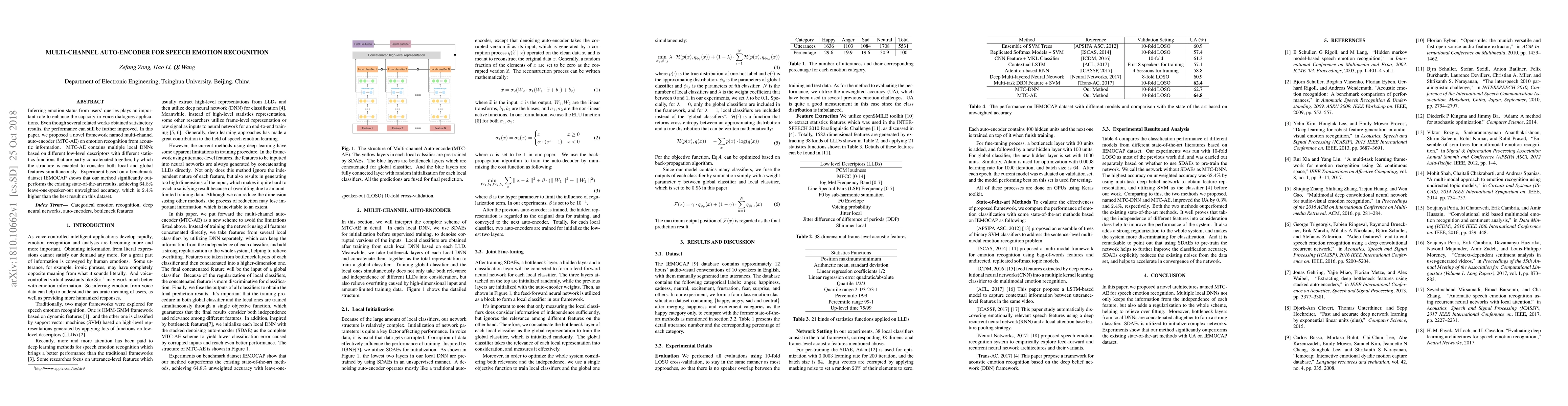 Inferring emotion status from users' queries plays an important role to enhance the capacity in voice dialogues applications. Even though several related works obtained satisfactory results, the performance can still be further improved. In this paper, we proposed a novel framework named multi-channel auto-encoder (MTC-AE) on emotion recognition from acoustic information. MTC-AE contains multiple local DNNs based on different low-level descriptors with different statistics functions that are partly concatenated together, by which the structure is enabled to consider both local and global features simultaneously. Experiment based on a benchmark dataset IEMOCAP shows that our method significantly outperforms the existing state-of-the-art results, achieving $64.8\%$ leave-one-speaker-out unweighted accuracy, which is $2.4\%$ higher than the best result on this dataset.
