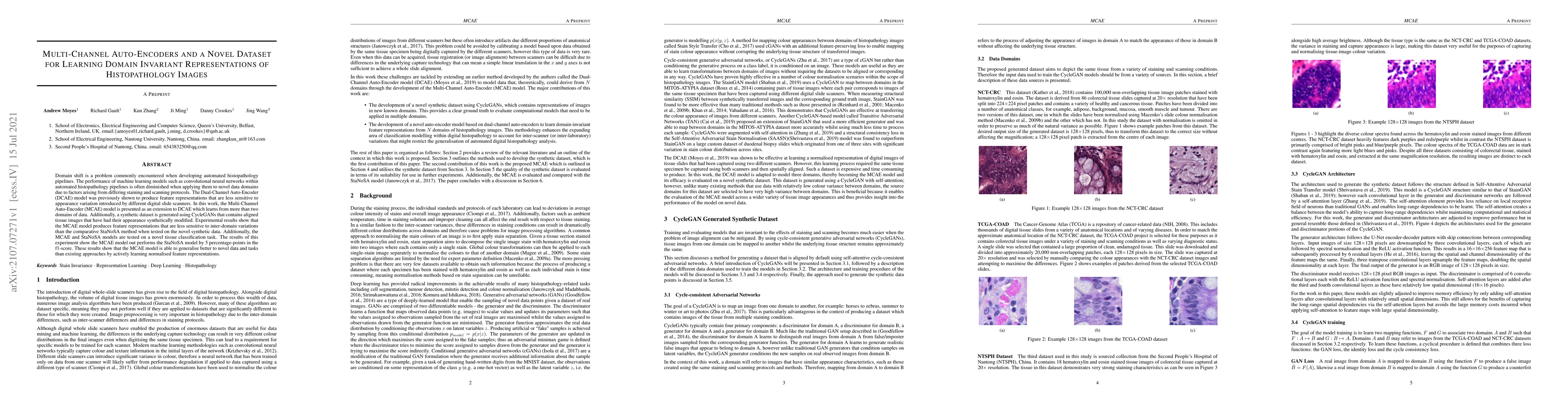 Domain shift is a problem commonly encountered when developing automated histopathology pipelines. The performance of machine learning models such as convolutional neural networks within automated histopathology pipelines is often diminished when applying them to novel data domains due to factors arising from differing staining and scanning protocols. The Dual-Channel Auto-Encoder (DCAE) model was previously shown to produce feature representations that are less sensitive to appearance variation introduced by different digital slide scanners. In this work, the Multi-Channel Auto-Encoder (MCAE) model is presented as an extension to DCAE which learns from more than two domains of data. Additionally, a synthetic dataset is generated using CycleGANs that contains aligned tissue images that have had their appearance synthetically modified. Experimental results show that the MCAE model produces feature representations that are less sensitive to inter-domain variations than the comparative StaNoSA method when tested on the novel synthetic data. Additionally, the MCAE and StaNoSA models are tested on a novel tissue classification task. The results of this experiment show the MCAE model out performs the StaNoSA model by 5 percentage-points in the f1-score. These results show that the MCAE model is able to generalise better to novel data and tasks than existing approaches by actively learning normalised feature representations.