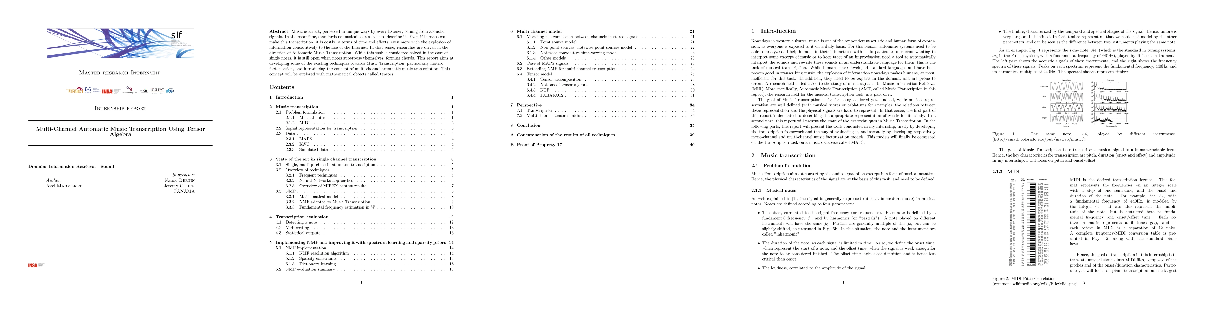 Music is an art, perceived in unique ways by every listener, coming from acoustic signals. In the meantime, standards as musical scores exist to describe it. Even if humans can make this transcription, it is costly in terms of time and efforts, even more with the explosion of information consecutively to the rise of the Internet. In that sense, researches are driven in the direction of Automatic Music Transcription. While this task is considered solved in the case of single notes, it is still open when notes superpose themselves, forming chords. This report aims at developing some of the existing techniques towards Music Transcription, particularly matrix factorization, and introducing the concept of multi-channel automatic music transcription. This concept will be explored with mathematical objects called tensors.