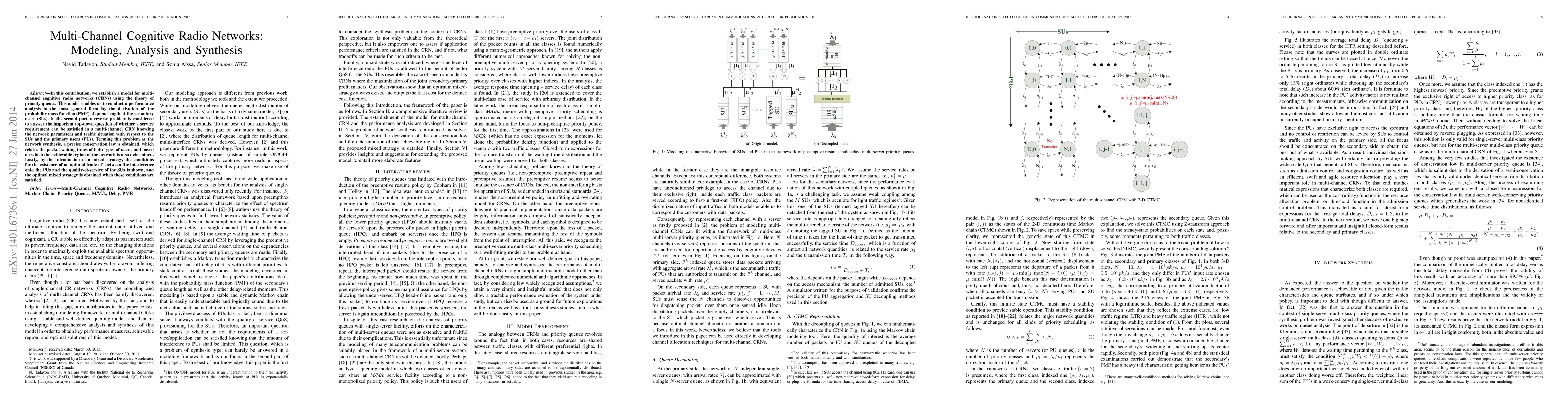 In this contribution, we establish a model for multichannel cognitive radio networks (CRNs) using the theory of priority queues. This model enables us to conduct a performance analysis in the most general form by the derivation of the probability mass function (PMF) of queue length at the secondary users (SUs). In the second part, a reverse problem is considered to answer the important top-down question of whether a service requirement can be satisfied in a multi-channel CRN knowing the network parameters and traffic situation with respect to the SUs and the primary users (PUs). Terming this problem as the network synthesis, a precise conservation law is obtained, which relates the packet waiting times of both types of users, and based on which the achievable region of the network is also determined. Lastly, by the introduction of a mixed strategy, the conditions for the existence of an optimal trade-off between the interference onto the PUs and the quality-of-service of the SUs is shown, and the optimal mixed strategy is obtained when those conditions are satisfied.