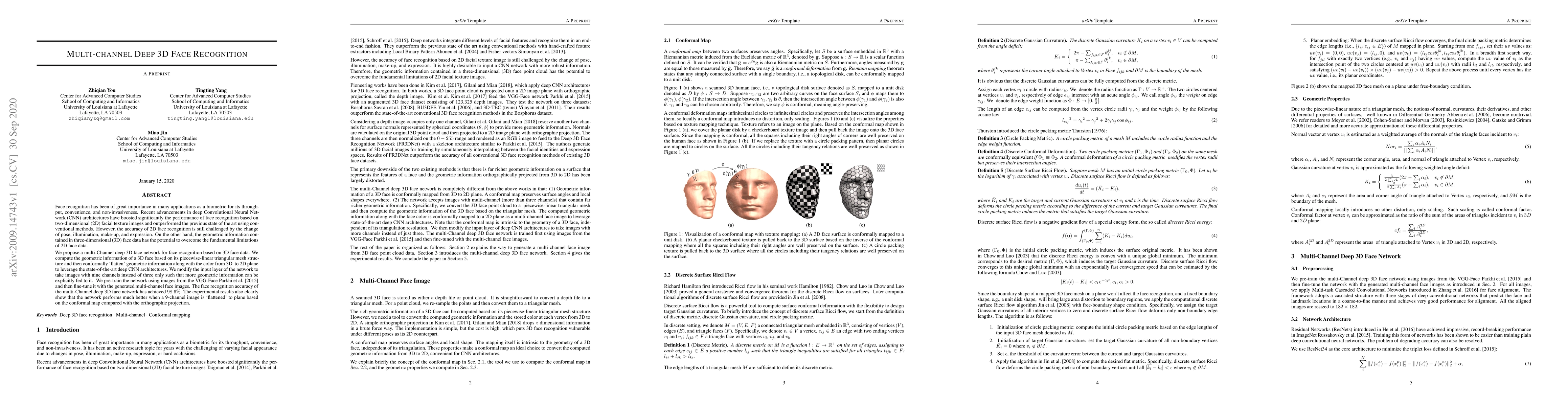 This paper proposes a multi-channel deep 3D face recognition network that leverages geometric information from 3D face data to improve recognition accuracy. The network uses a conformal map to flatten 3D face data, feeding nine channels of information into the network to enhance performance, achieving 98.6% accuracy.