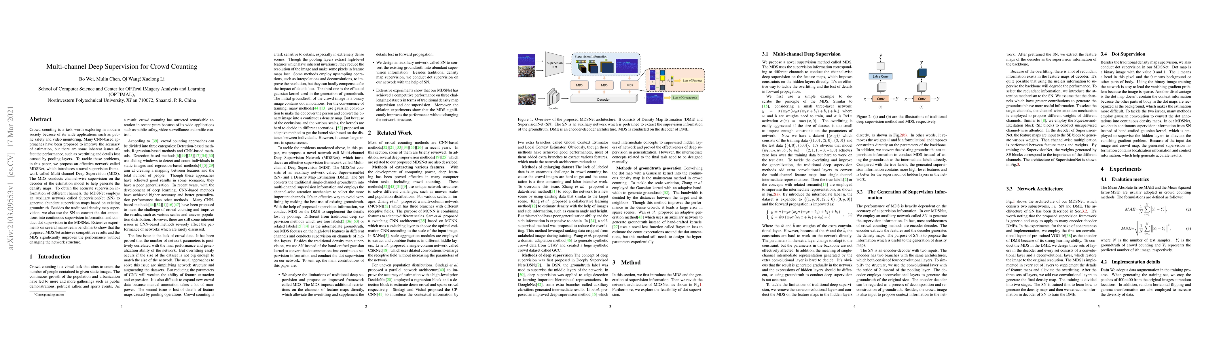 This paper proposes MDSNet, a novel network with Multi-channel Deep Supervision (MDS) to enhance crowd counting accuracy. MDSNet uses SupervisionNet to generate detailed supervision maps, addressing overfitting and detail loss, and achieves competitive performance on benchmarks.