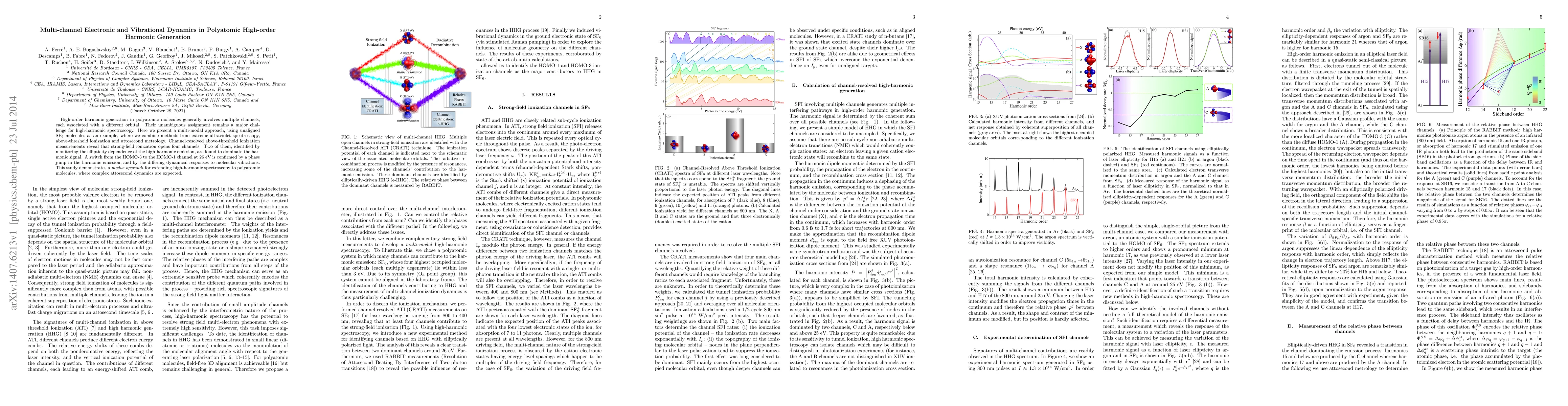 This paper presents a multi-modal approach combining extreme-ultraviolet spectroscopy, above-threshold ionization, and attosecond metrology to resolve multiple ionization channels in high-order harmonic generation from polyatomic SF$_6$ molecules. It identifies two dominant channels and confirms a channel switch via phase jump and vibrational dynamics analysis.