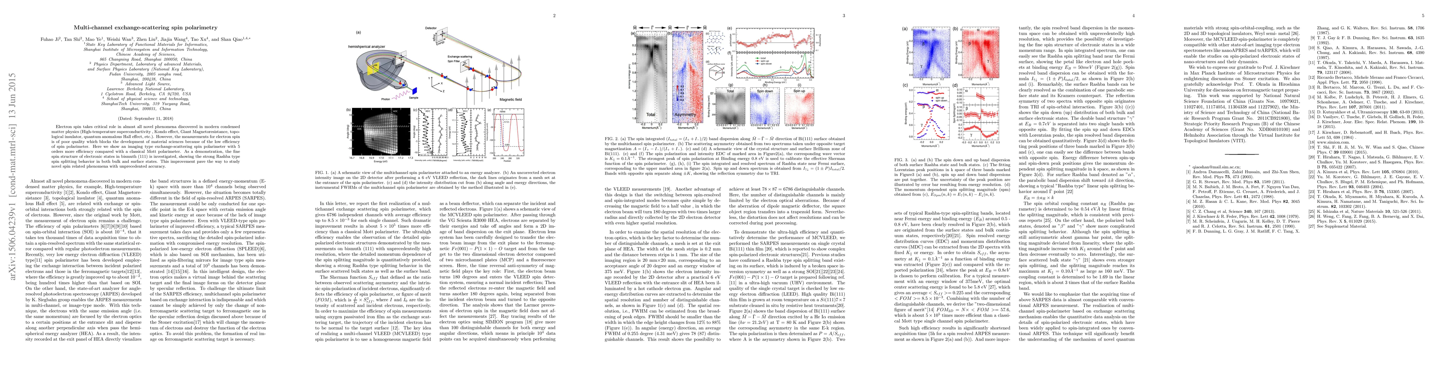 Electron spin takes critical role in almost all novel phenomena discovered in modern condensed matter physics (High-temperature superconductivity, Kondo effect, Giant Magnetoresistance, topological insulator, quantum anomalous Hall effect, etc.). However, the measurements for electron spin is of poor quality which blocks the development of material sciences because of the low efficiency of spin polarimeter. Here we show an imaging type exchange-scattering spin polarimeter with 5 orders more efficiency compared with a classical Mott polarimeter. As a demonstration, the fine spin structure of electronic states in bismuth (111) is investigated, showing the strong Rashba type spin splitting behavior in both bulk and surface states. This improvement pave the way to study novel spin related phenomena with unprecedented accuracy.