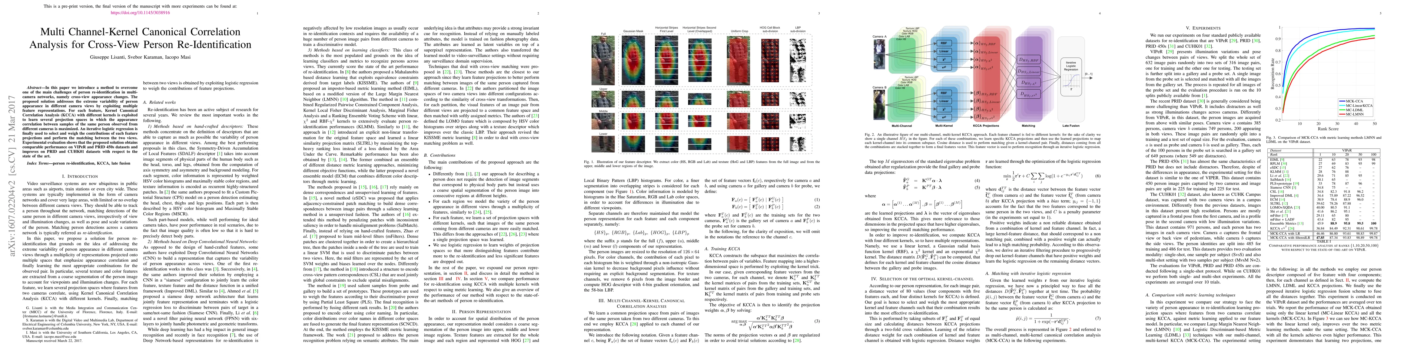 This paper proposes a Multi Channel-Kernel Canonical Correlation Analysis (KCCA) method to tackle person re-identification challenges across different camera views, leveraging multiple feature representations to maximize appearance correlation. The approach uses iterative logistic regression to select and weigh feature projections, achieving state-of-the-art performance on several datasets.