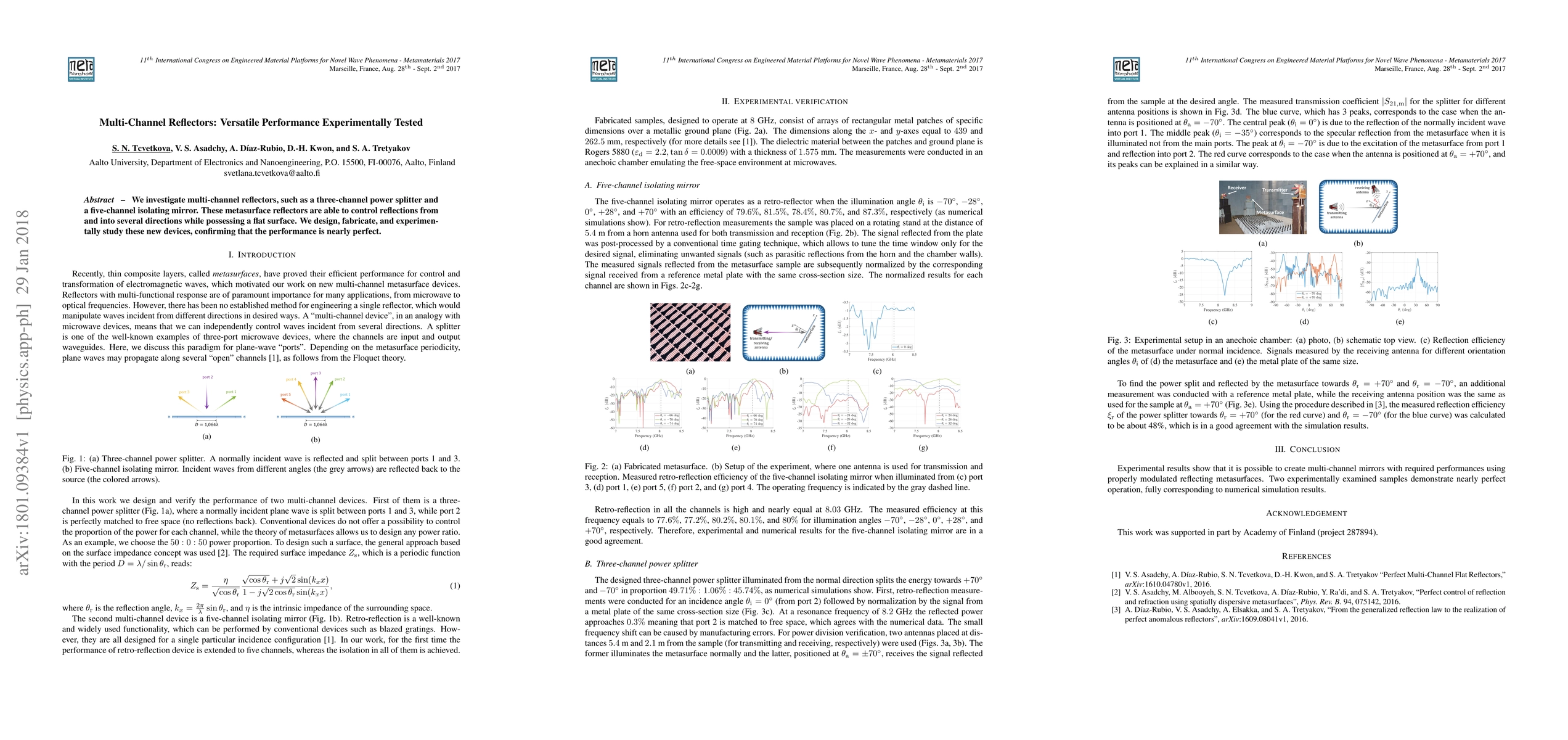 Summary: This research presents the design, fabrication, and experimental validation of multi-channel reflectors, including a three-channel power splitter and a five-channel isolating mirror, which control reflections into multiple directions with near-perfect performance.