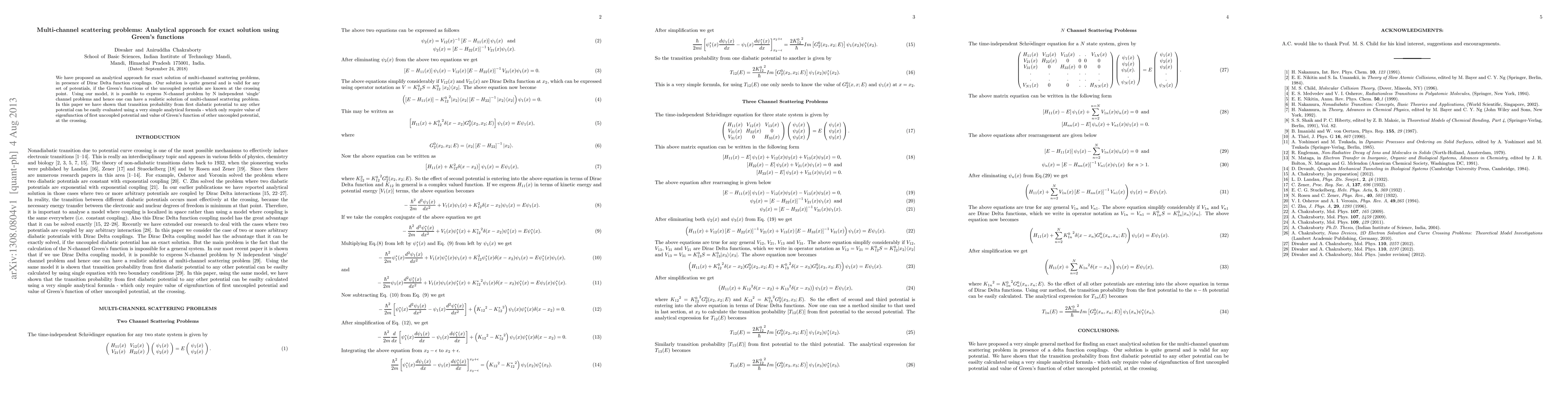 This paper presents an analytical method for solving multi-channel scattering problems using Green's functions, allowing the decomposition of an N-channel problem into N independent single-channel problems. The approach provides a simple formula to evaluate transition probabilities between potentials using eigenfunction values and Green's functions at the crossing point.