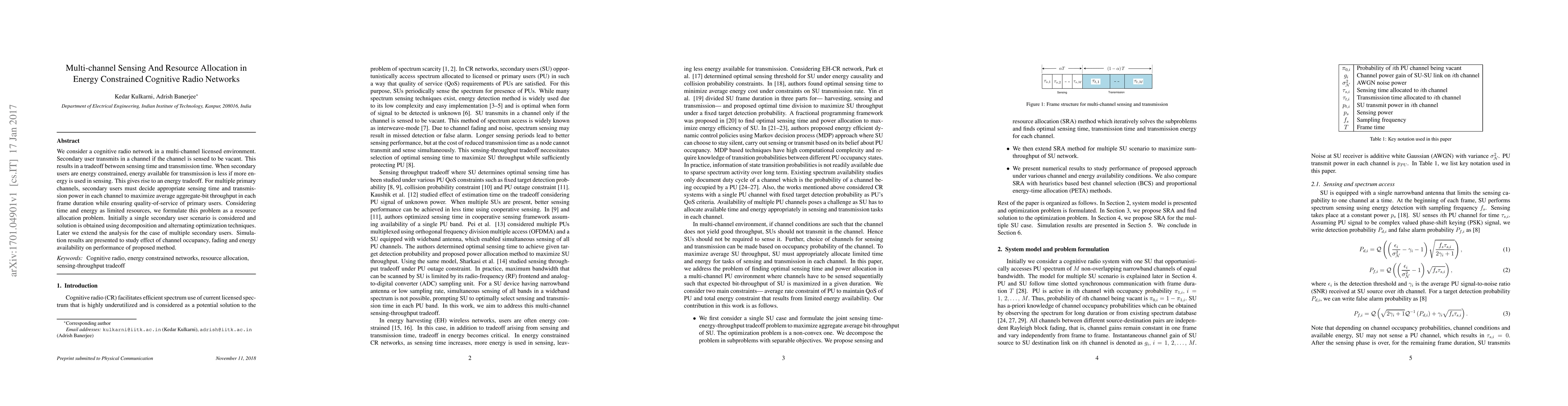 This paper investigates multi-channel sensing and resource allocation in energy-constrained cognitive radio networks, focusing on maximizing aggregate throughput while ensuring primary users' quality-of-service. Solutions are derived using decomposition and optimization techniques for both single and multiple secondary users, with simulations evaluating the impact of channel conditions and energy levels.