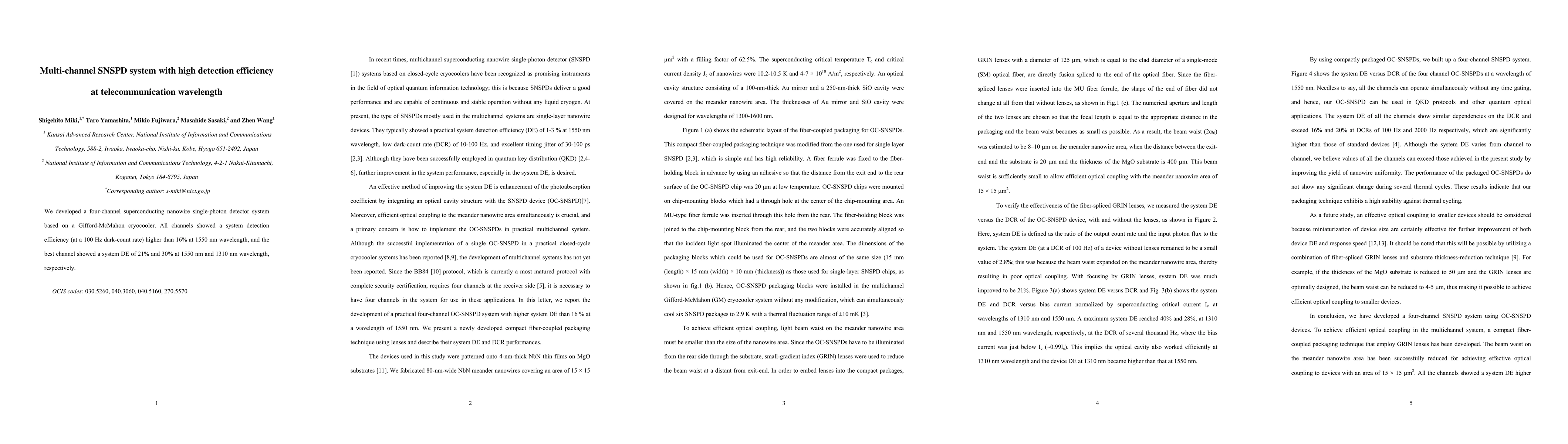 This paper presents a four-channel superconducting nanowire single-photon detector system with high detection efficiency at telecommunication wavelengths, achieving efficiencies over 16% at 1550 nm, with the best channel reaching 21% at this wavelength and 30% at 1310 nm.