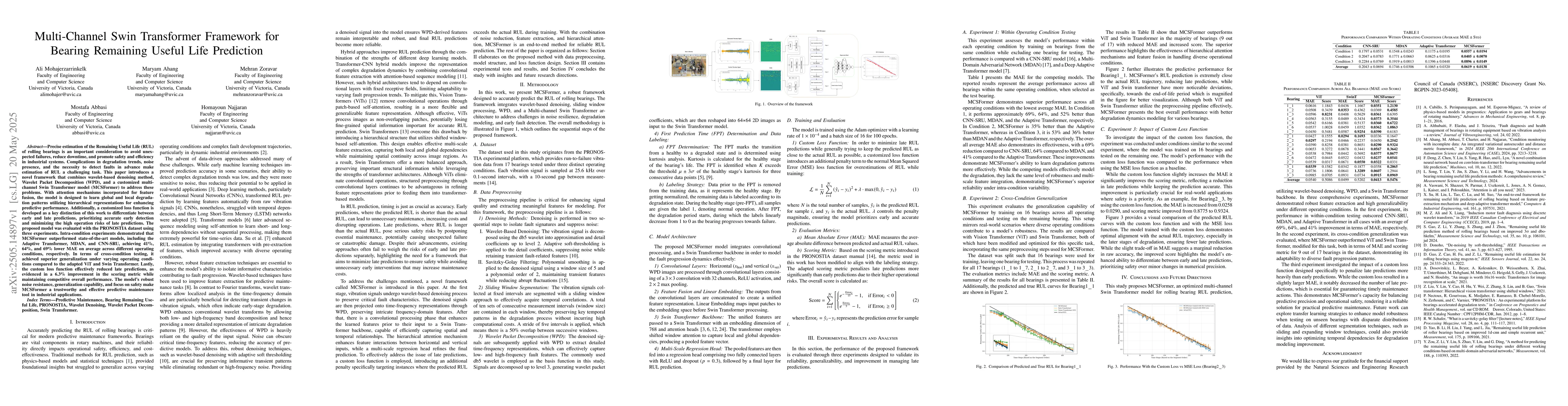 The research proposes a novel framework combining wavelet-based denoising (Wavelet Packet Decomposition) with a customized multi-channel Swin Transformer model (MCSFormer) for bearing RUL prediction. The MCSFormer incorporates attention mechanisms for feature fusion, learning global and local degradation patterns using hierarchical representations.