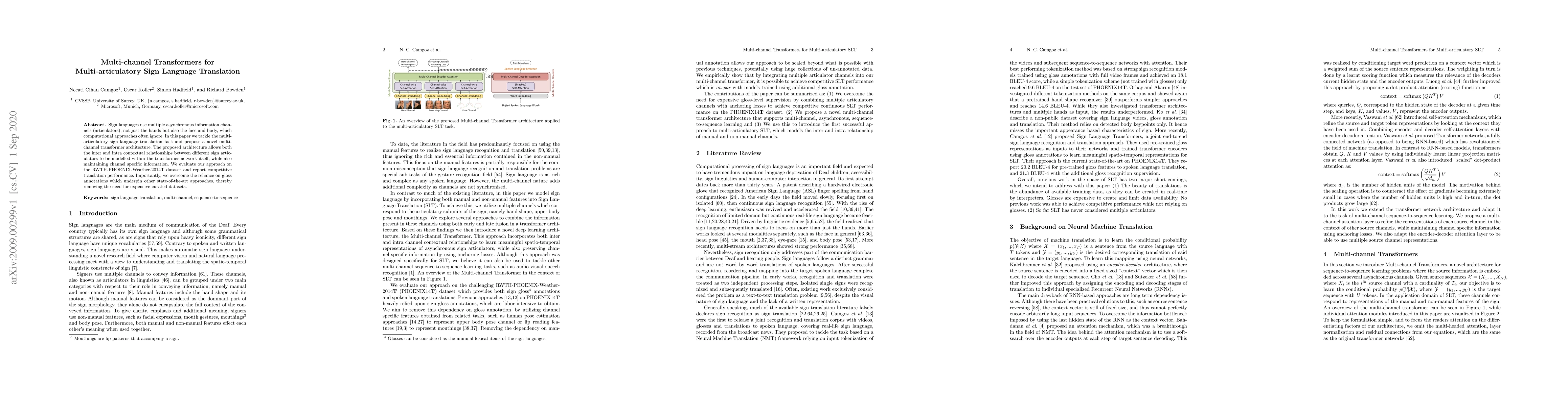 This paper proposes a multi-channel transformer architecture to tackle the translation of multi-articulatory sign language, modeling relationships between hands, face, and body. It achieves competitive translation performance on the RWTH-PHOENIX-Weather-2014T dataset without relying on gloss annotations, eliminating the need for curated datasets.