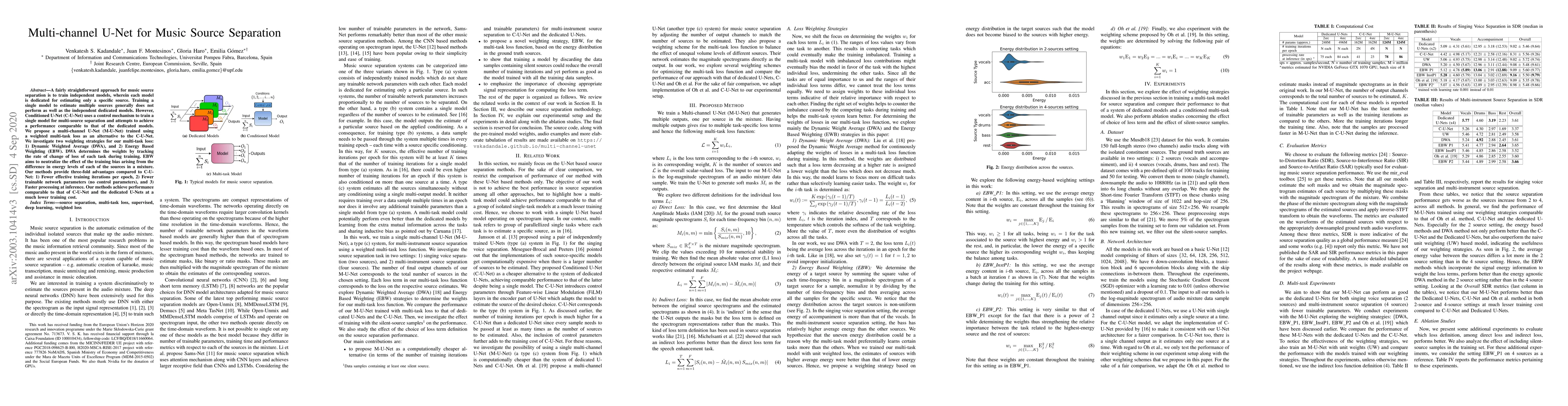 The paper proposes a multi-channel U-Net (M-U-Net) for music source separation, trained using a weighted multi-task loss to achieve performance comparable to dedicated models with fewer training iterations, parameters, and faster inference. Two weighting strategies are explored: Dynamic Weighted Average and Energy Based Weighting.