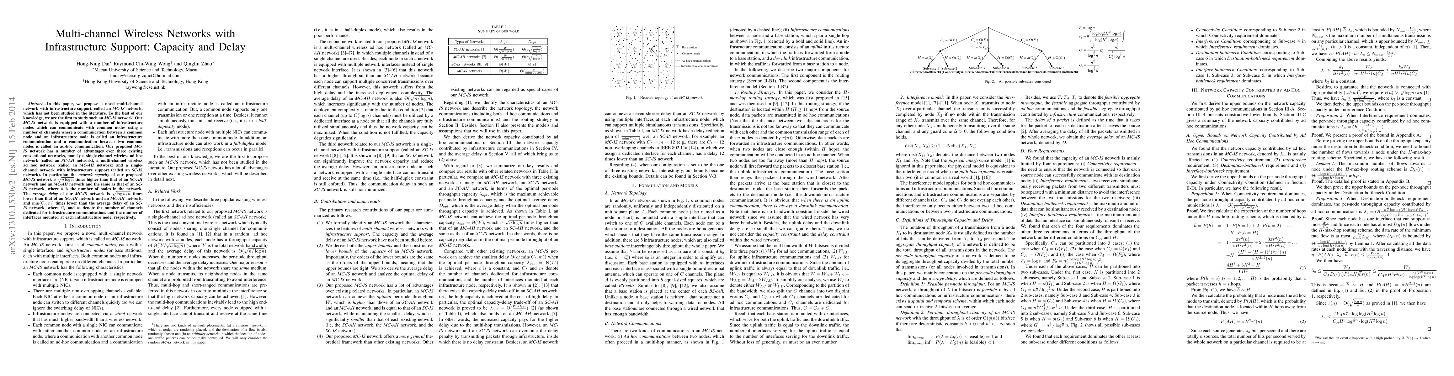 The paper proposes a novel multi-channel wireless network with infrastructure support, called an MC-IS network, and analyzes its capacity and delay. The research methodology involves deriving upper and lower bounds on network capacity contributed by both ad-hoc and infrastructure communications, using a combination of theoretical analysis and constructive lower bounds.