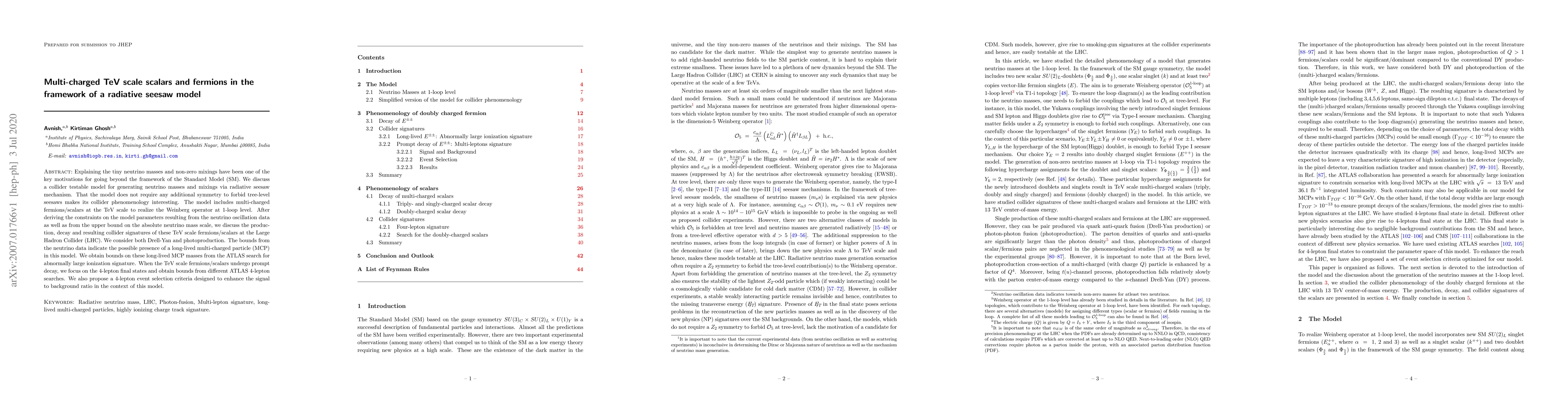 This paper proposes a radiative seesaw model for generating neutrino masses without requiring tree-level seesaw mechanisms, featuring multi-charged TeV scale fermions/scalars. It discusses collider phenomenology, production, decay, and signatures of these particles at the LHC, proposing a 4-lepton event selection to enhance signal detection.