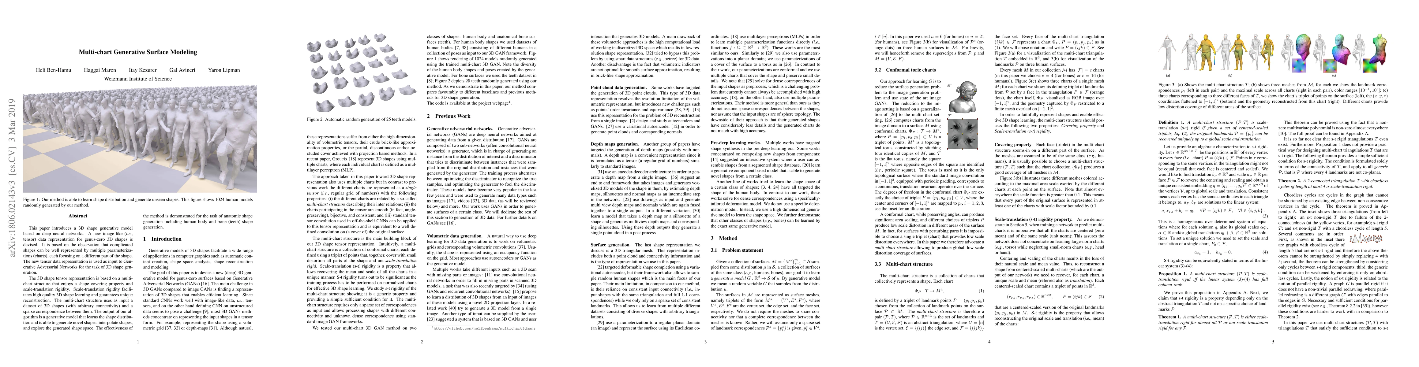 This paper introduces a 3D shape generative model based on deep neural networks. A new image-like (i.e., tensor) data representation for genus-zero 3D shapes is devised. It is based on the observation that complicated shapes can be well represented by multiple parameterizations (charts), each focusing on a different part of the shape. The new tensor data representation is used as input to Generative Adversarial Networks for the task of 3D shape generation. The 3D shape tensor representation is based on a multi-chart structure that enjoys a shape covering property and scale-translation rigidity. Scale-translation rigidity facilitates high quality 3D shape learning and guarantees unique reconstruction. The multi-chart structure uses as input a dataset of 3D shapes (with arbitrary connectivity) and a sparse correspondence between them. The output of our algorithm is a generative model that learns the shape distribution and is able to generate novel shapes, interpolate shapes, and explore the generated shape space. The effectiveness of the method is demonstrated for the task of anatomic shape generation including human body and bone (teeth) shape generation.
