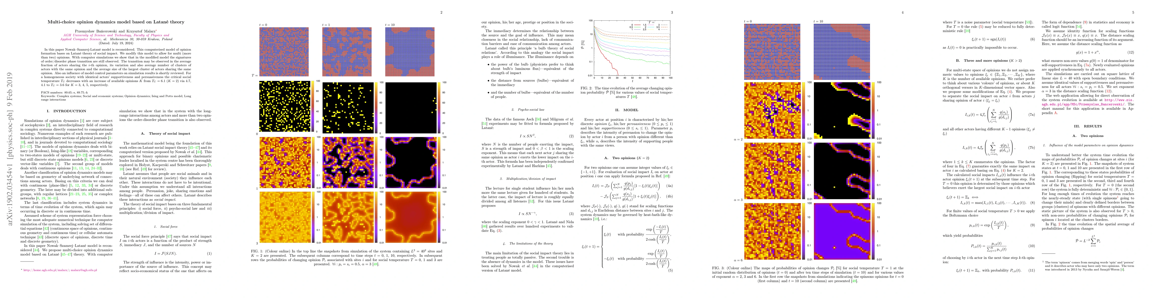In this paper Nowak--Szamrej-Latan\'e model is reconsidered. This computerised model of opinion formation bases on Latan\'e theory of social impact. We modify this model to allow for multi (more than two) opinions. With computer simulations we show that in the modified model the signatures of order/disorder phase transition are still observed. The transition may be observed in the average fraction of actors sharing the $i$-th opinion, its variation and also average number of clusters of actors with the same opinion and the average size of the largest cluster of actors sharing the same opinion. Also an influence of model control parameters on simulation results is shortly reviewed. For a homogeneous society with identical actors' supportiveness and persuasiveness the critical social temperature $T_C$ decreases with an increase of available opinions $K$ from $T_C=6.1$ ($K=2$) via 4.7, 4.1 to $T_C=3.6$ for $K=3$, 4, 5, respectively.