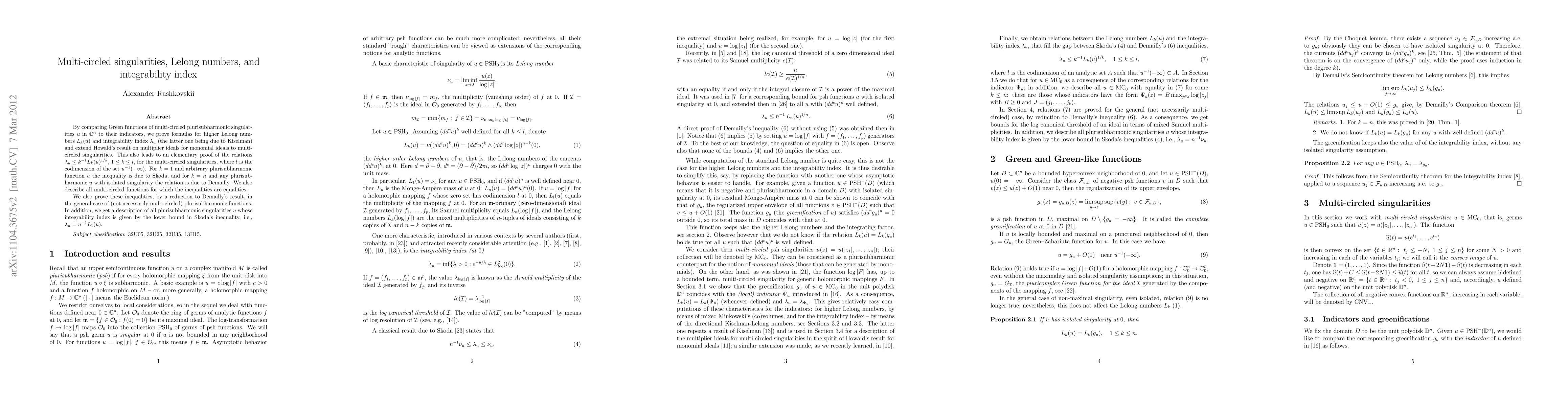 By comparing Green functions of multi-circled plurisubharmonic singularities in the n-domensional complex space to their indicators, we obtain formulas for the higher Lelong numbers and integrability index for such singularities and extend Howald's result on multiplier ideals for monomial ideals to multi-circled singularities. This also leads to an elementary proof of the relations between the k-th Lelong numbers and the integrability index. For k=1 and arbitrary plurisubharmonic functions the inequality is due to Skoda, and for k=n and any plurisubharmonic function with isolated singularity the relation is due to Demailly. We also describe multi-circled functions for which the inequalities are equalities. By a reduction to Demailly's inequality we prove these inequalities in the general case of plurisubharmonic functions as well. In addition, we get a description of all plurisubharmonic singularities whose integrability index is given by the lower bound in Skoda's inequality.