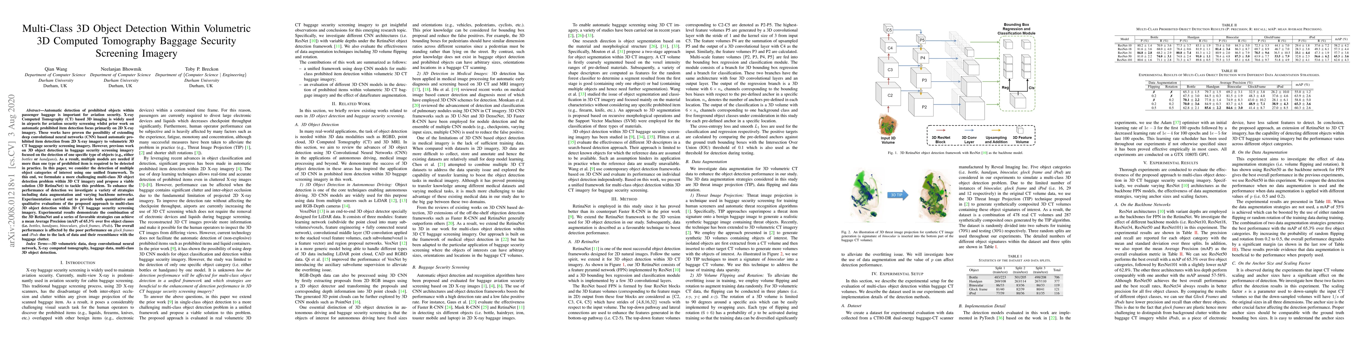 This paper proposes a unified framework, 3D RetinaNet, for multi-class 3D object detection in volumetric CT baggage security screening imagery, addressing the limitation of previous models that detect only specific object types. The approach achieves a mean Average Precision (mAP) of 65.3% for detecting five object categories, though performance varies due to data scarcity and object similarity to baggage clutter.