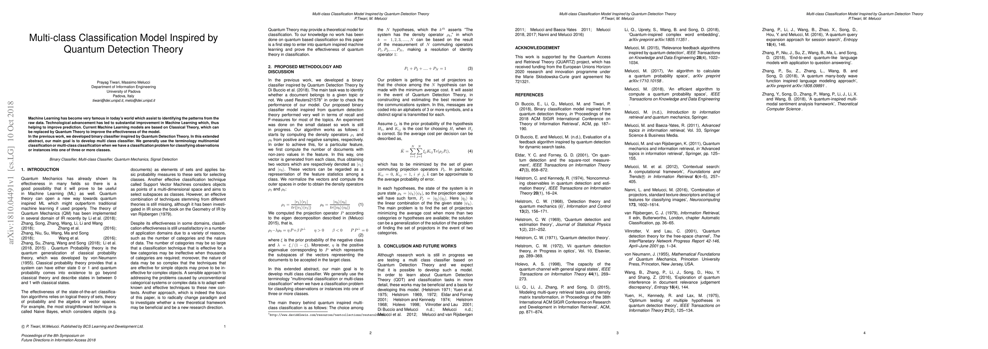 Machine Learning has become very famous currently which assist in identifying the patterns from the raw data. Technological advancement has led to substantial improvement in Machine Learning which, thus helping to improve prediction. Current Machine Learning models are based on Classical Theory, which can be replaced by Quantum Theory to improve the effectiveness of the model. In the previous work, we developed binary classifier inspired by Quantum Detection Theory. In this extended abstract, our main goal is to develop multi-class classifier. We generally use the terminology multinomial classification or multi-class classification when we have a classification problem for classifying observations or instances into one of three or more classes.