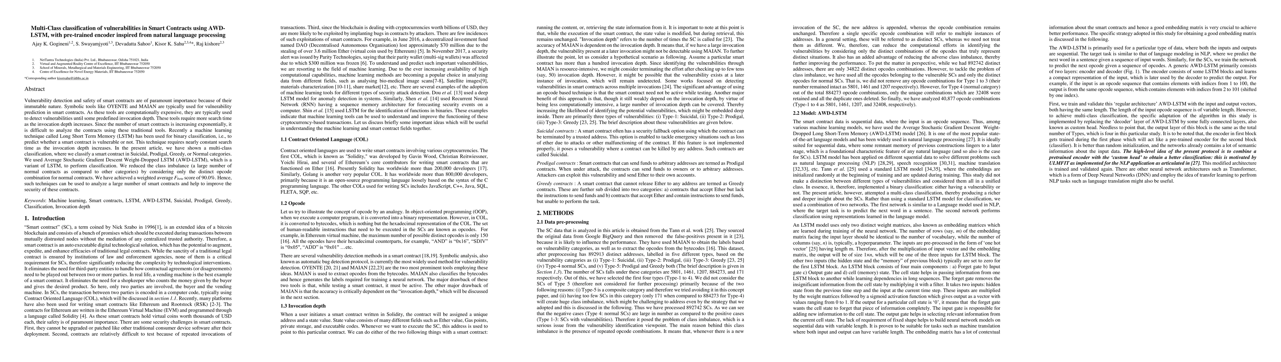Vulnerability detection and safety of smart contracts are of paramount importance because of their immutable nature. Symbolic tools like OYENTE and MAIAN are typically used for vulnerability prediction in smart contracts. As these tools are computationally expensive, they are typically used to detect vulnerabilities until some predefined invocation depth. These tools require more search time as the invocation depth increases. Since the number of smart contracts is increasing exponentially, it is difficult to analyze the contracts using these traditional tools. Recently a machine learning technique called Long Short Term Memory (LSTM) has been used for binary classification, i.e., to predict whether a smart contract is vulnerable or not. This technique requires nearly constant search time as the invocation depth increases. In the present article, we have shown a multi-class classification, where we classify a smart contract in Suicidal, Prodigal, Greedy, or Normal categories. We used Average Stochastic Gradient Descent Weight-Dropped LSTM (AWD-LSTM), which is a variant of LSTM, to perform classification. We reduced the class imbalance (a large number of normal contracts as compared to other categories) by considering only the distinct opcode combination for normal contracts. We have achieved a weighted average Fbeta score of 90.0%. Hence, such techniques can be used to analyze a large number of smart contracts and help to improve the security of these contracts.