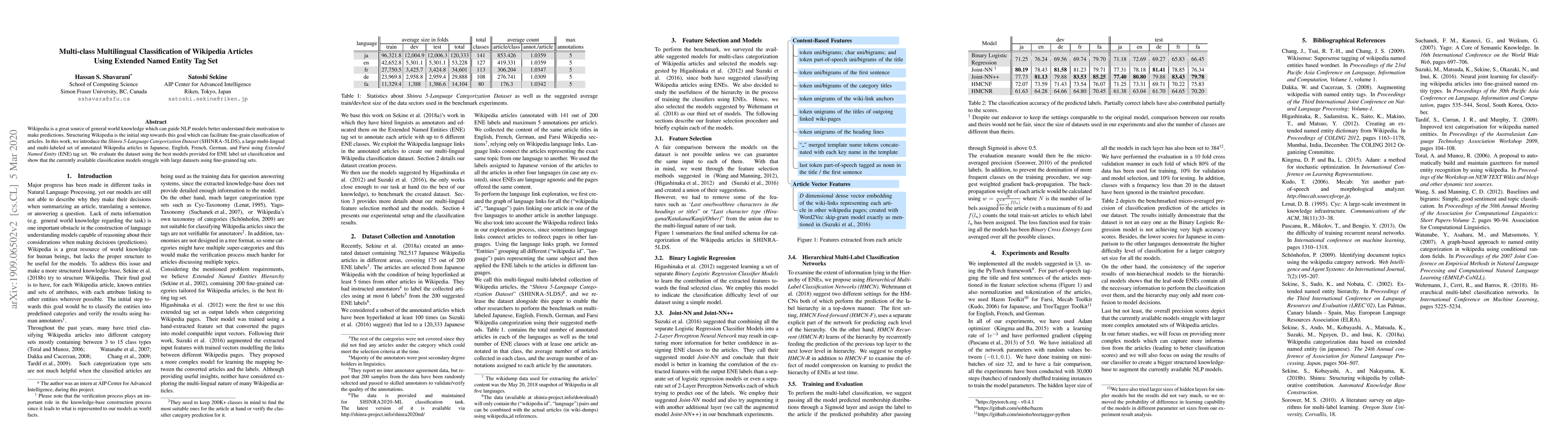 Wikipedia is a great source of general world knowledge which can guide NLP models better understand their motivation to make predictions. Structuring Wikipedia is the initial step towards this goal which can facilitate fine-grain classification of articles. In this work, we introduce the Shinra 5-Language Categorization Dataset (SHINRA-5LDS), a large multi-lingual and multi-labeled set of annotated Wikipedia articles in Japanese, English, French, German, and Farsi using Extended Named Entity (ENE) tag set. We evaluate the dataset using the best models provided for ENE label set classification and show that the currently available classification models struggle with large datasets using fine-grained tag sets.