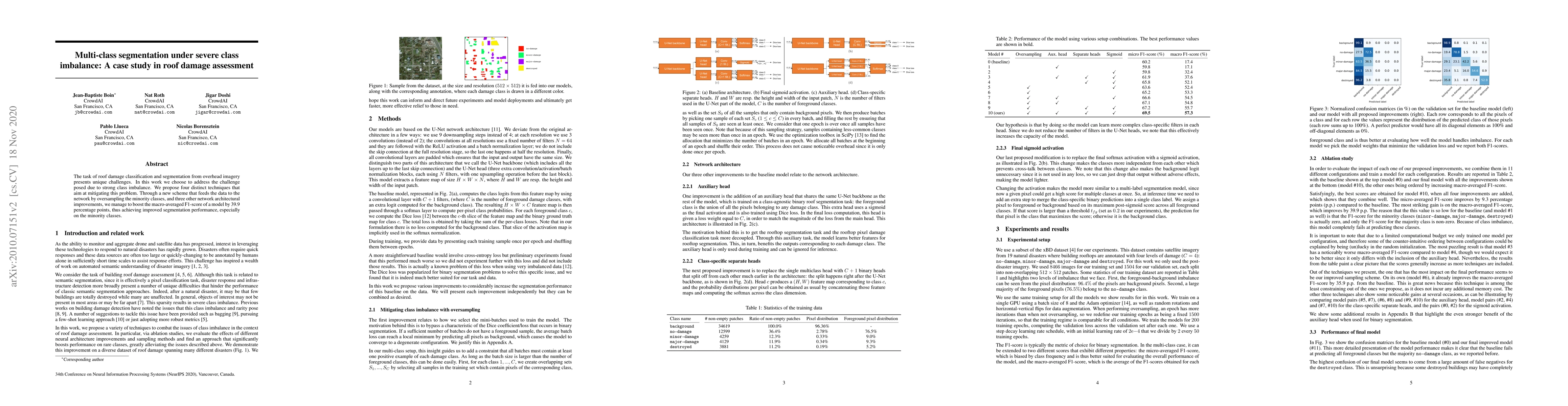 The task of roof damage classification and segmentation from overhead imagery presents unique challenges. In this work we choose to address the challenge posed due to strong class imbalance. We propose four distinct techniques that aim at mitigating this problem. Through a new scheme that feeds the data to the network by oversampling the minority classes, and three other network architectural improvements, we manage to boost the macro-averaged F1-score of a model by 39.9 percentage points, thus achieving improved segmentation performance, especially on the minority classes.