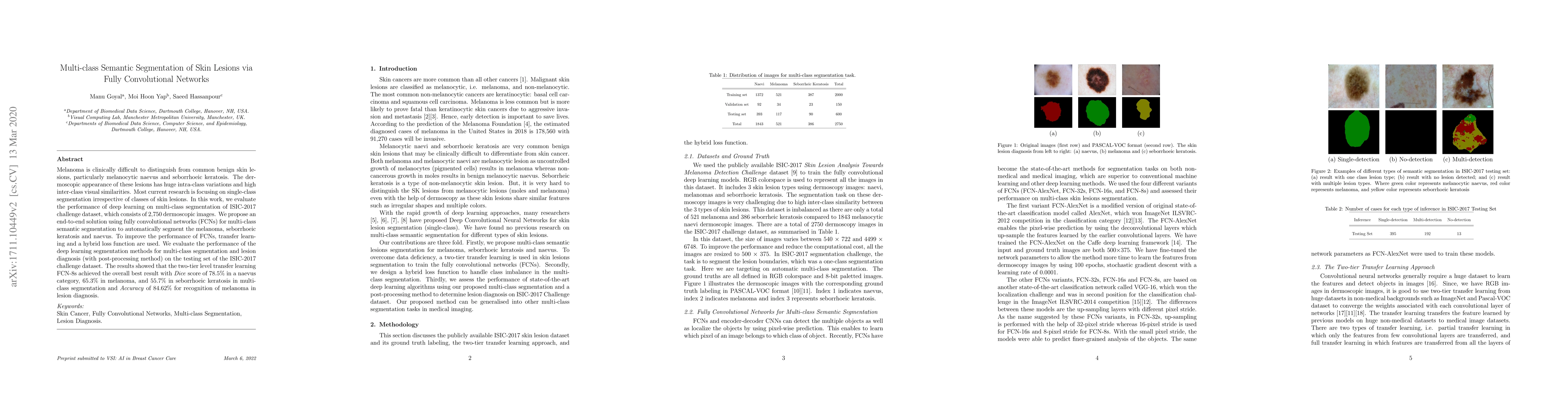 This paper proposes a fully convolutional network (FCN) for multi-class semantic segmentation of skin lesions, including melanoma, seborrhoeic keratosis, and naevus, using the ISIC-2017 dataset. The approach employs transfer learning and a hybrid loss function to enhance segmentation performance, achieving a Dice score of 78.5%, 65.3%, and 55.7% for the respective classes, and an overall accuracy of 84.62% for melanoma recognition.