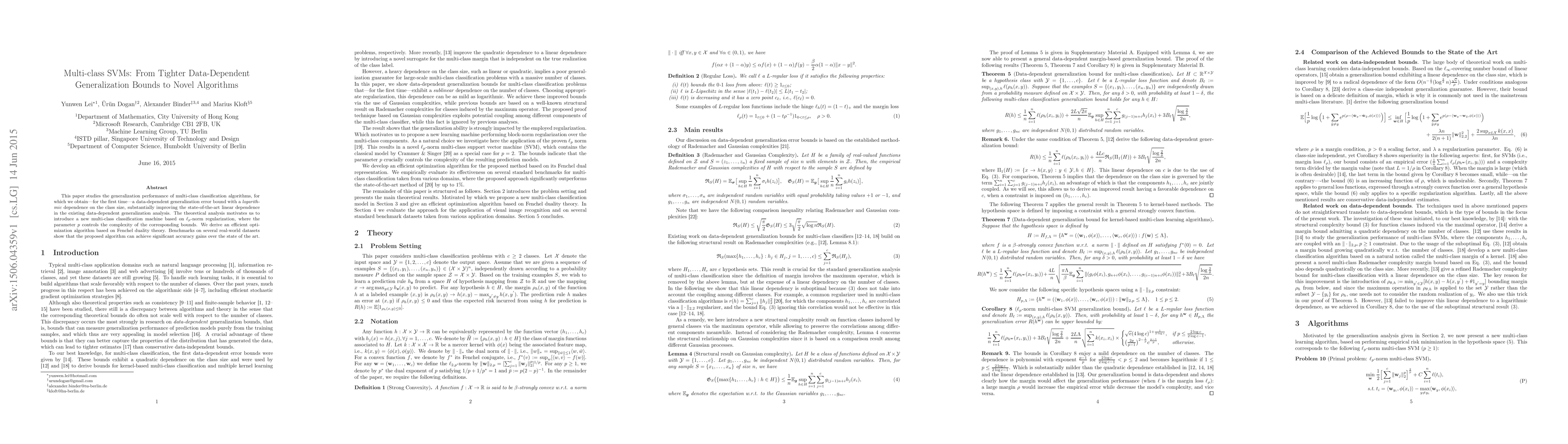 This paper presents improved data-dependent generalization bounds for multi-class SVMs, achieving a logarithmic dependence on class size. It introduces a novel $\ell_p$-norm regularization algorithm with an efficient optimization method, demonstrating superior performance on real-world datasets.