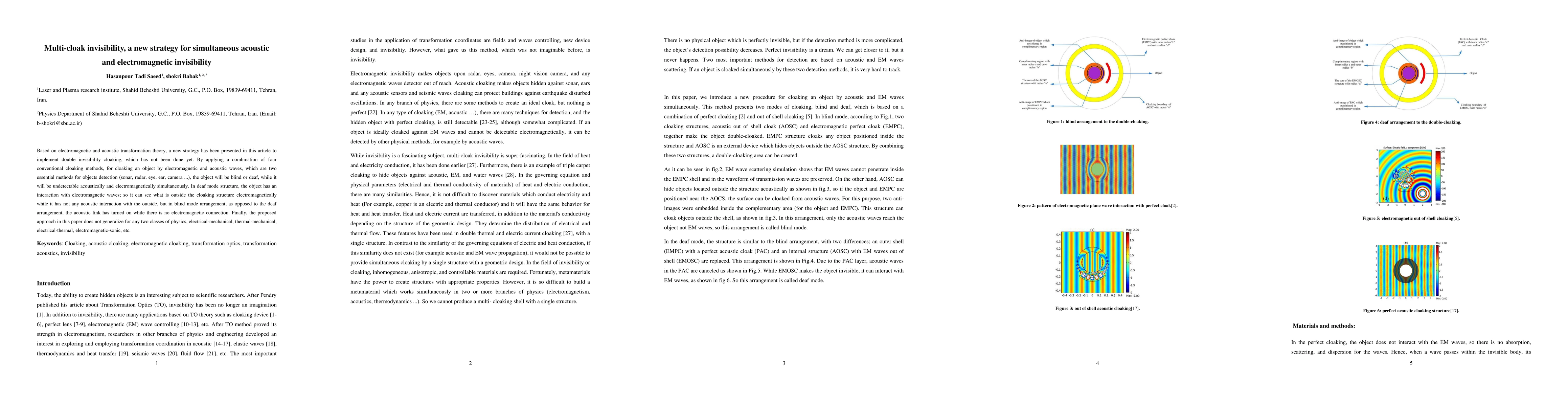 This paper introduces a novel strategy for simultaneous acoustic and electromagnetic invisibility using a combination of four conventional cloaking methods. The proposed approach allows objects to be undetectable by both sonar and radar while maintaining electromagnetic visibility in a "deaf mode" and acoustic visibility in a "blind mode."