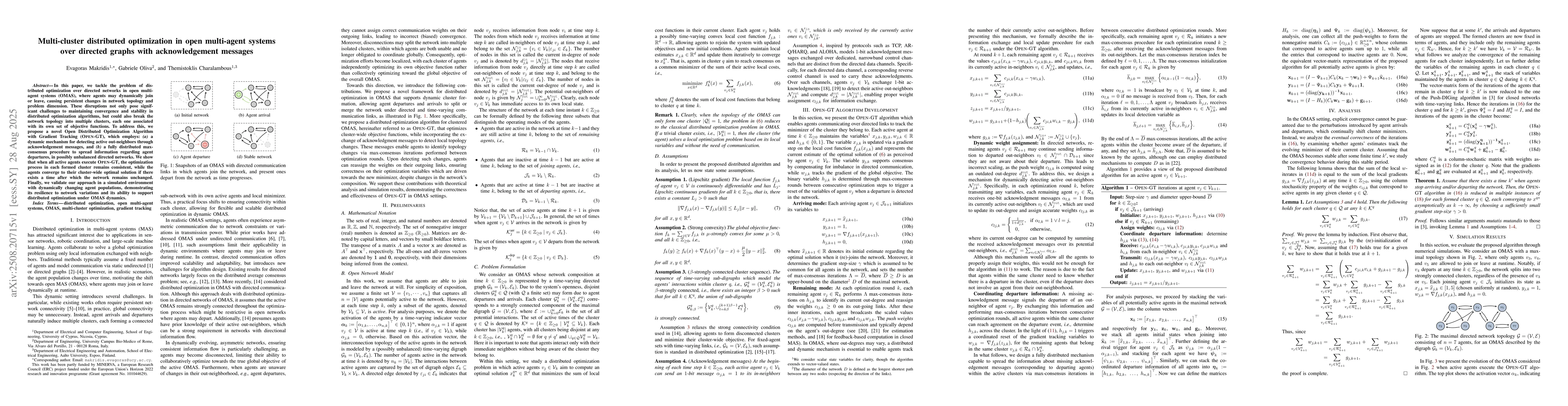 In this paper, we tackle the problem of distributed optimization over directed networks in open multi-agent systems (OMAS), where agents may dynamically join or leave, causing persistent changes in network topology and problem dimension. These disruptions not only pose significant challenges to maintaining convergence and stability in distributed optimization algorithms, but could also break the network topology into multiple clusters, each one associated with its own set of objective functions. To address this, we propose a novel Open Distributed Optimization Algorithm with Gradient Tracking (OPEN-GT), which employs: (a) a dynamic mechanism for detecting active out-neighbors through acknowledgement messages, and (b) a fully distributed max-consensus procedure to spread information regarding agent departures, in possibly unbalanced directed networks. We show that when all active agents execute OPEN-GT, the optimization process in each formed cluster remains consistent, while the agents converge to their cluster-wide optimal solution if there exists a time after which the network remains unchanged. Finally, we validate our approach in a simulated environment with dynamically changing agent populations, demonstrating its resilience to network variations and its ability to support distributed optimization under OMAS dynamics.