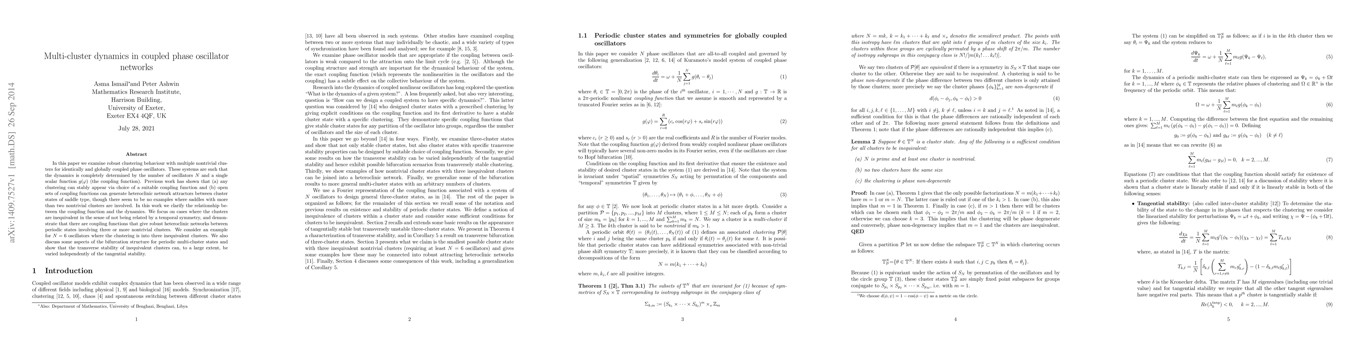 In this paper we examine robust clustering behaviour with multiple nontrivial clusters for identically and globally coupled phase oscillators. These systems are such that the dynamics is completely determined by the number of oscillators N and a single scalar function $g(\varphi)$ (the coupling function). Previous work has shown that (a) any clustering can stably appear via choice of a suitable coupling function and (b) open sets of coupling functions can generate heteroclinic network attractors between cluster states of saddle type, though there seem to be no examples where saddles with more than two nontrivial clusters are involved. In this work we clarify the relationship between the coupling function and the dynamics. We focus on cases where the clusters are inequivalent in the sense of not being related by a temporal symmetry, and demonstrate that there are coupling functions that give robust heteroclinic networks between periodic states involving three or more nontrivial clusters. We consider an example for N=6 oscillators where the clustering is into three inequivalent clusters. We also discuss some aspects of the bifurcation structure for periodic multi-cluster states and show that the transverse stability of inequivalent clusters can, to a large extent, be varied independently of the tangential stability.