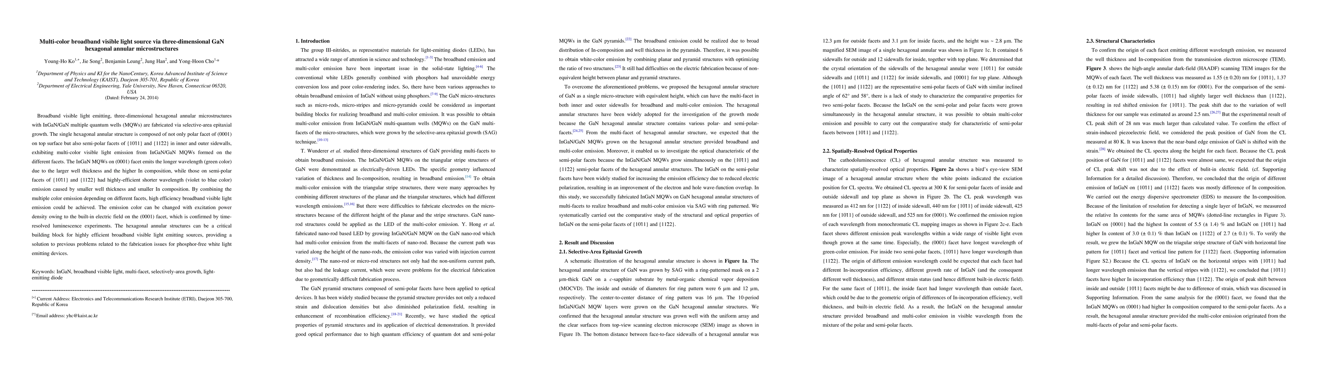 Broadband visible light emitting, three-dimensional hexagonal annular microstructures with InGaN/GaN multiple quantum wells (MQWs) are fabricated via selective-area epitaxial growth. The single hexagonal annular structure is composed of not only polar facet of (0001) on top surface but also semi-polar facets of {10-11} and {11-22} in inner and outer sidewalls, exhibiting multi-color visible light emission from InGaN/GaN MQWs formed on the different facets. The InGaN MQWs on (0001) facet emits the longer wavelength (green color) due to the larger well thickness and the higher In composition, while those on semi-polar facets of {10-11} and {11-22} had highly-efficient shorter wavelength (violet to blue color) emission caused by smaller well thickness and smaller In composition. By combining the multiple color emission depending on different facets, high efficiency broadband visible light emission could be achieved. The emission color can be changed with excitation power density owing to the built-in electric field on the (0001) facet, which is confirmed by time-resolved luminescence experiments. The hexagonal annular structures can be a critical building block for highly efficient broadband visible light emitting sources, providing a solution to previous problems related to the fabrication issues for phosphor-free white light emitting devices.