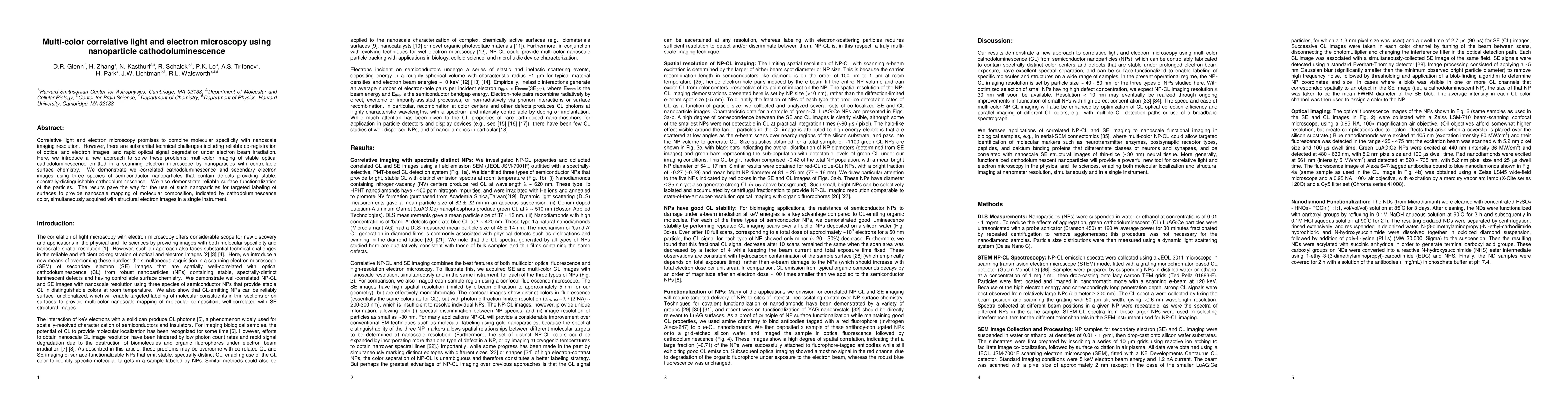 This paper introduces a novel method for multi-color correlative light and electron microscopy using nanoparticles that emit stable cathodoluminescence in a scanning electron microscope. The approach addresses co-registration challenges and optical signal degradation, enabling nanoscale mapping of molecular composition with structural electron images.