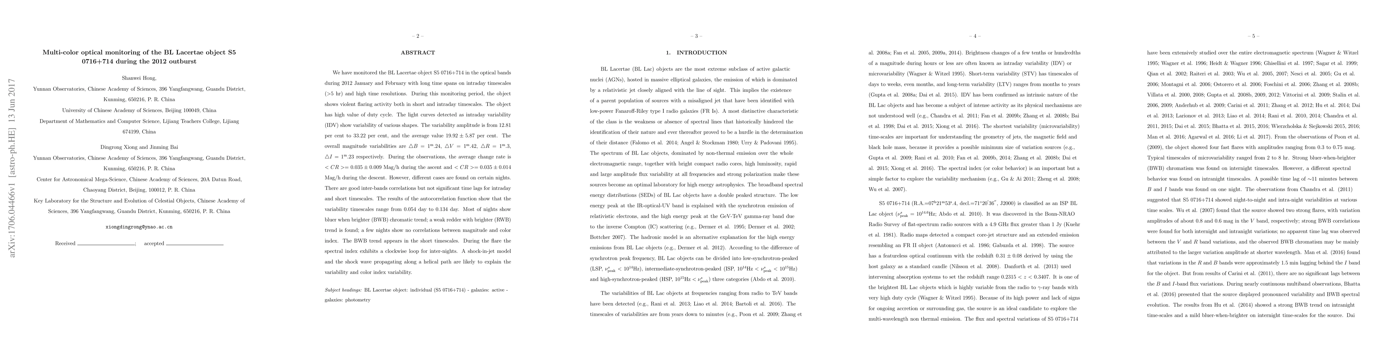 Researchers monitored BL Lacertae object S5 0716+714 in optical bands from January to February 2012, discovering violent flaring activity with varying shapes and amplitudes of variability in color indices and magnitudes.