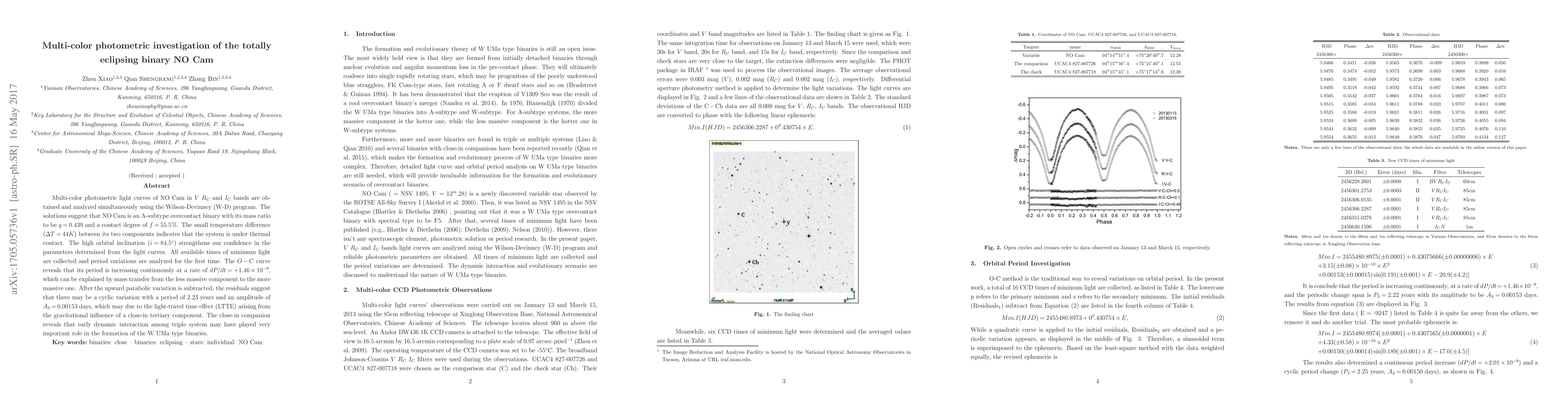 Multi-color photometric light curves of NO Cam in $V$ $R_C$ and $I_C$ bands are obtained and analyzed simultaneously using the Wilson-Devinney (W-D) program. The solutions suggest that NO Cam is an A-subtype overcontact binary with its mass ratio to be $q = 0.439$ and a contact degree of $f = 55.5\,\%$. The small temperature difference ($\Delta T = 44K$) between its two components indicates that the system is under thermal contact. The high orbital inclination ($i = 84.5^{\circ}$) strengthens our confidence in the parameters determined from the light curves. All available times of minimum light are collected and period variations are analyzed for the first time. The $O - C$ curve reveals that its period is increasing continuously at a rate of $dP/dt=+1.46\times{10^{-9}}$, which can be explained by mass transfer from the less massive component to the more massive one. After the upward parabolic variation is subtracted, the residuals suggest that there may be a cyclic variation with a period of 2.23 years and an amplitude of $A_3 = 0.00153$ days, which may due to the light-travel time effect (LTTE) arising from the gravitational influence of a close-in tertiary component. The close-in companion reveals that early dynamic interaction among triple system may have played very important role in the formation of the W UMa type binaries.